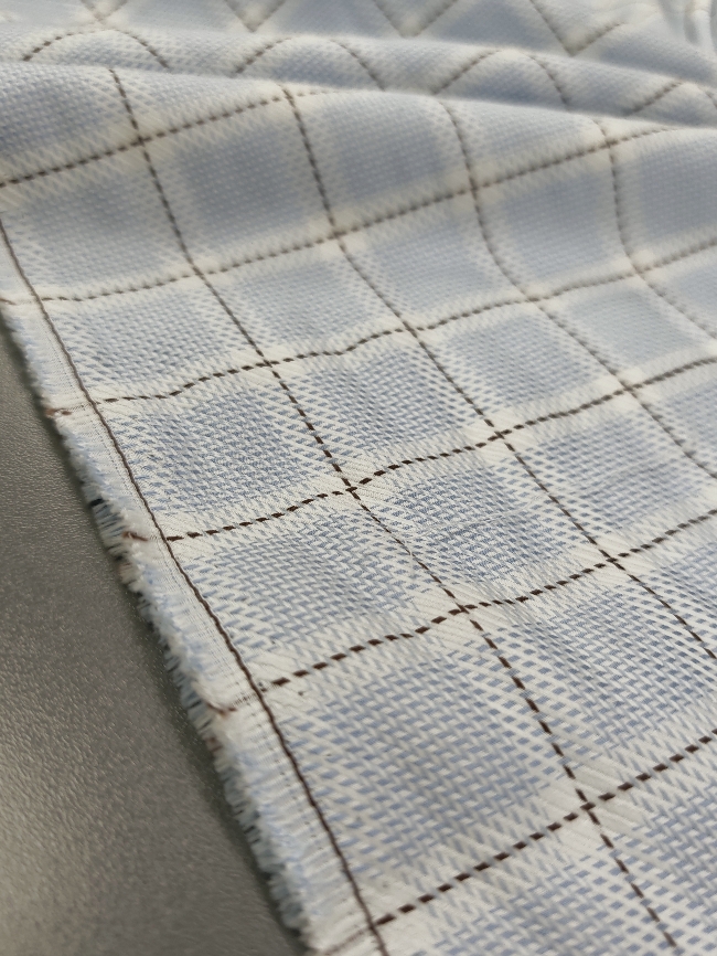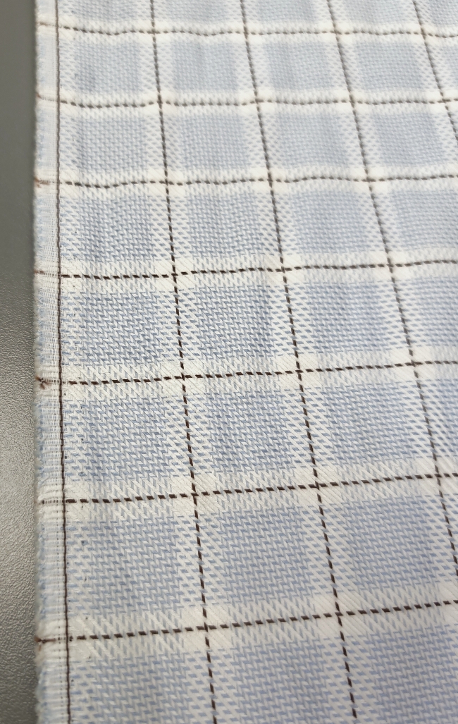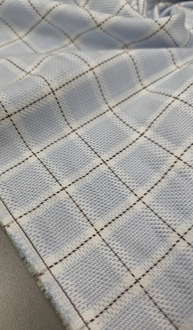 Glatki i lagani poplin s jasnim bijelo-plavim kariranim uzorkom. Tkanina dobro drži oblik, ugodna je na dodir i prikladna je za šivanje košulja, bluza, haljina i dječje odjeće. Uzorak je čist i uredan, prikladan za svakodnevnu i svečaniju upotrebu.