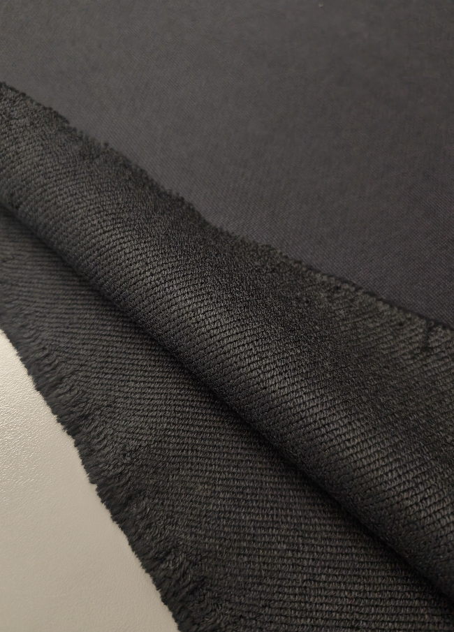 Visokokvalitetni crni flis s blagim plavičastim tonom. Mekano, ugodno i blago elastično pletivo za džempere, majice s kapuljačom, haljine i dječju odjeću. Unutrašnjost je glatka i udobna za nošenje, pa je materijal prikladan za svakodnevno nošenje.