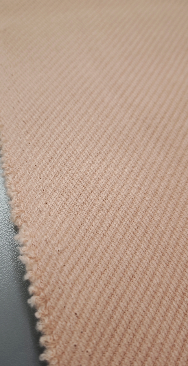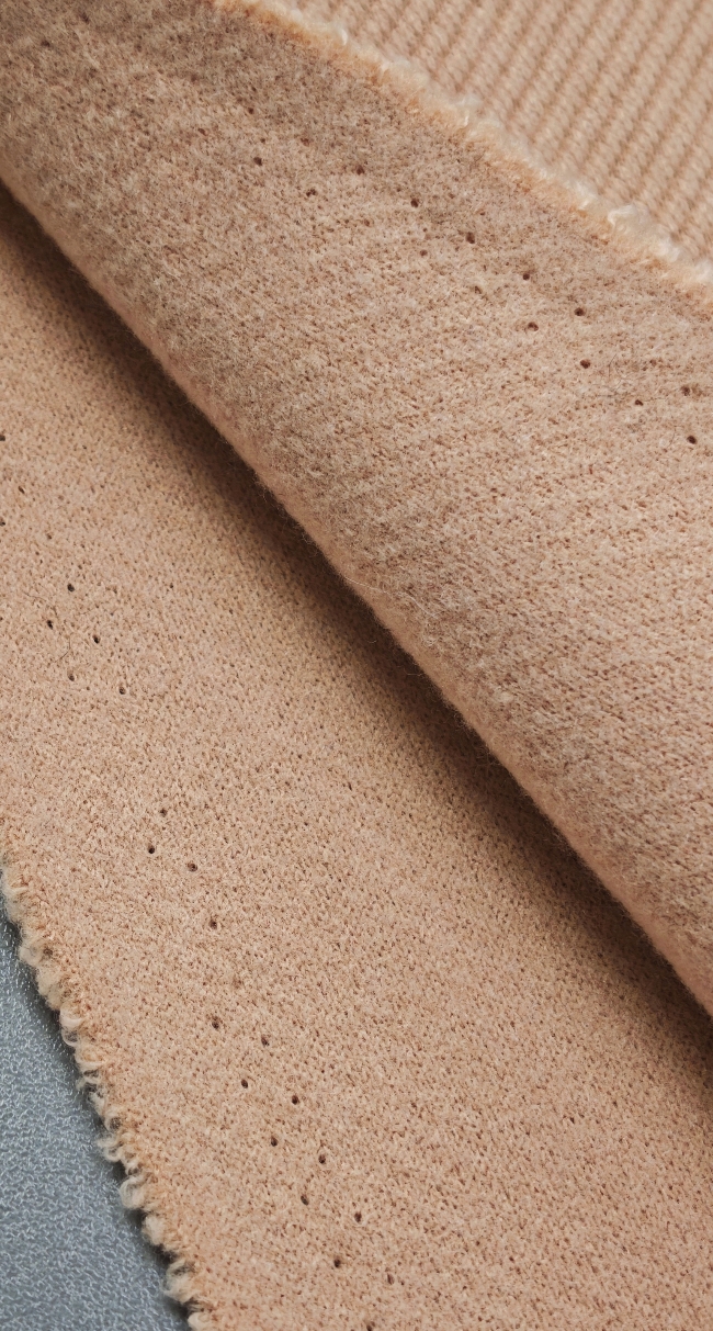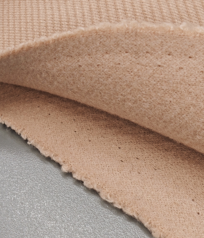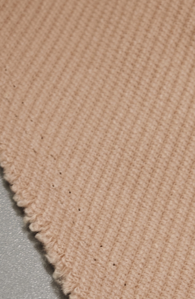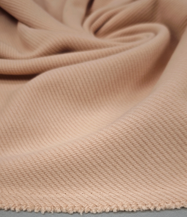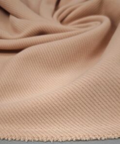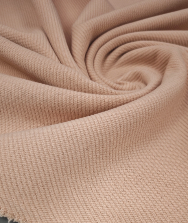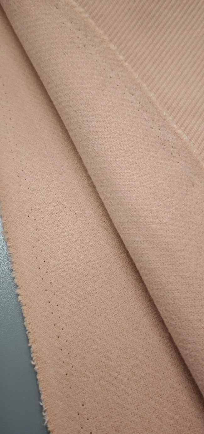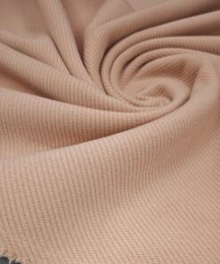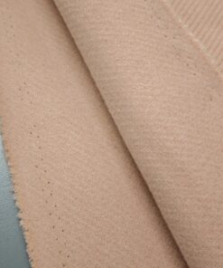 Topla vunena mješavina u nježnoj marelica-roza nijansi, namijenjena izradi zimskih kaputa i jakni. Materijal je čvrst, ugodan na dodir i stabilan, dobro drži kroj i zadržava uredan izgled.