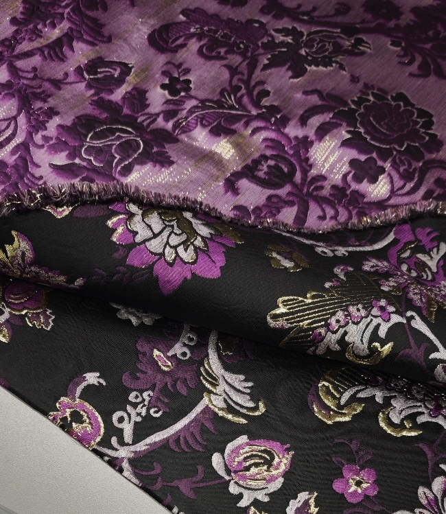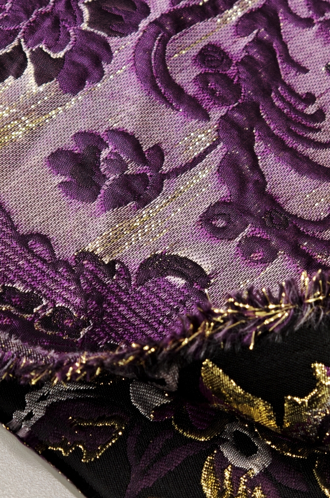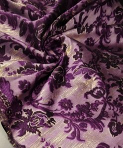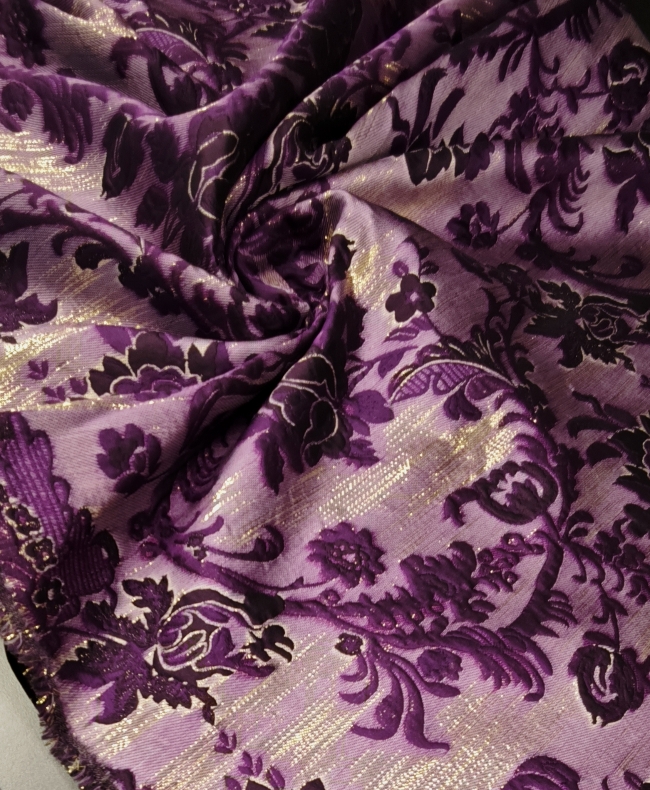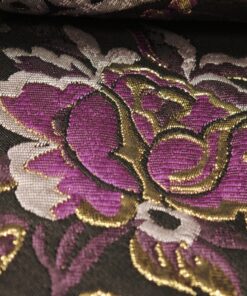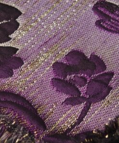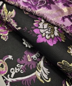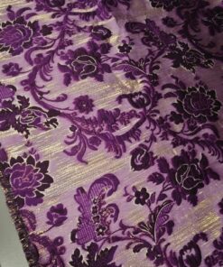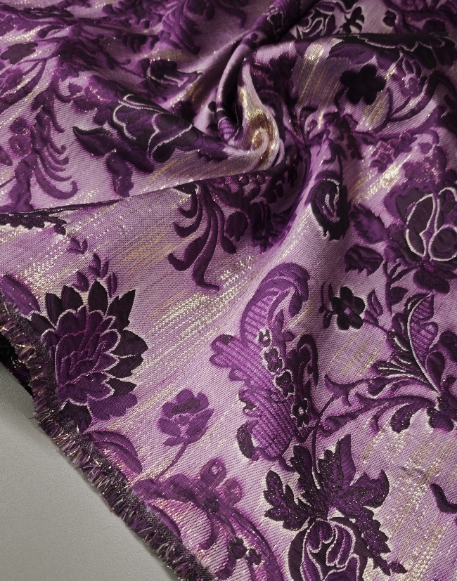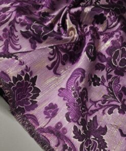 Ovaj kraljevski obostrani žakard s ljubičasto-zlatim cvjetnim uzorkom odiše luksuzom i profinjenošću. Tkanina je čvrsta, ali mekana na dodir, s bogatim sjajem koji se predivno mijenja ovisno o svjetlu. Idealan je izbor za šivanje elegantne odjeće poput sakoa, haljina, suknji ili modnih detalja, ali i za dekorativne projekte — jastučiće, stolnjake i ukrasne zavjese.
