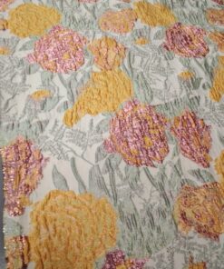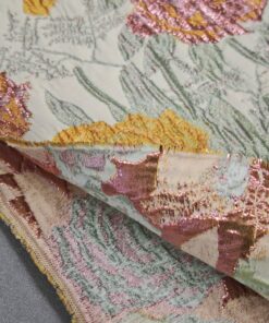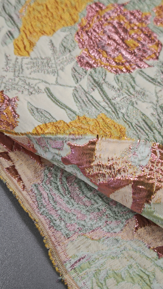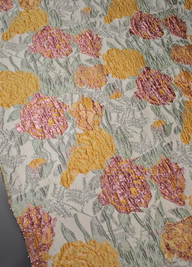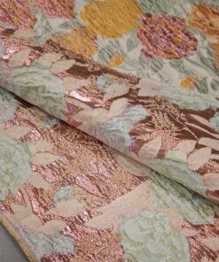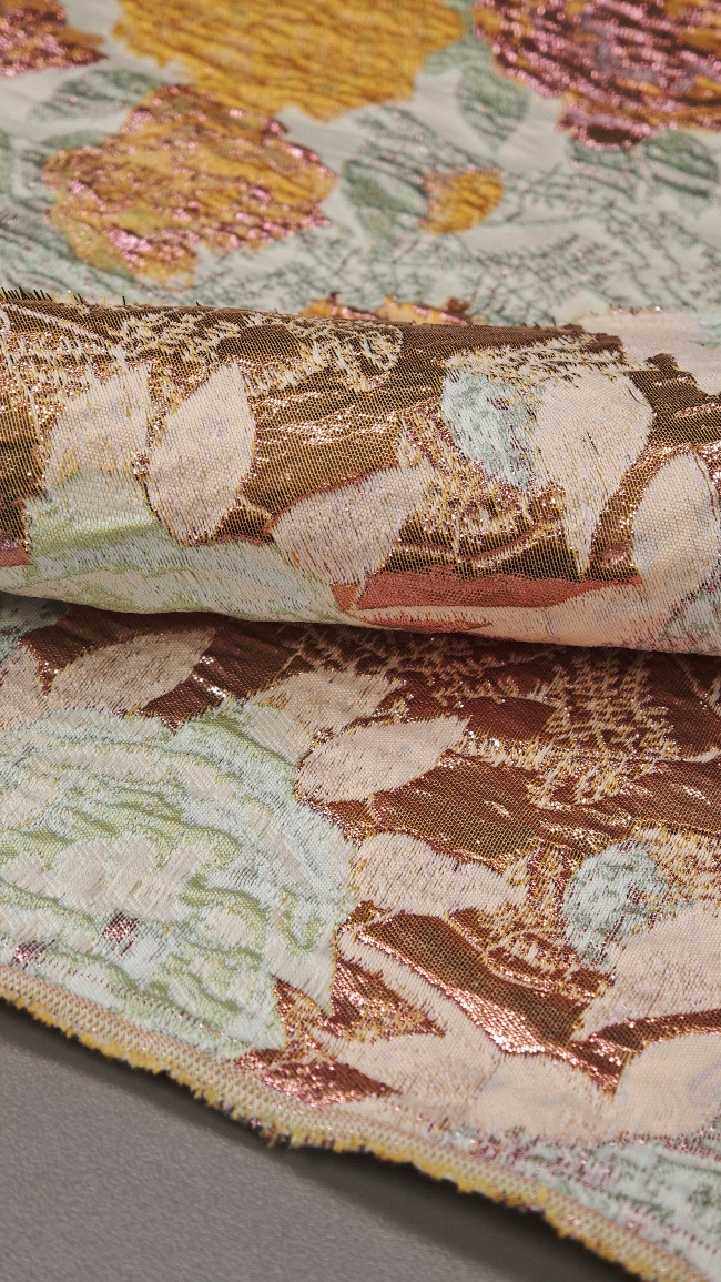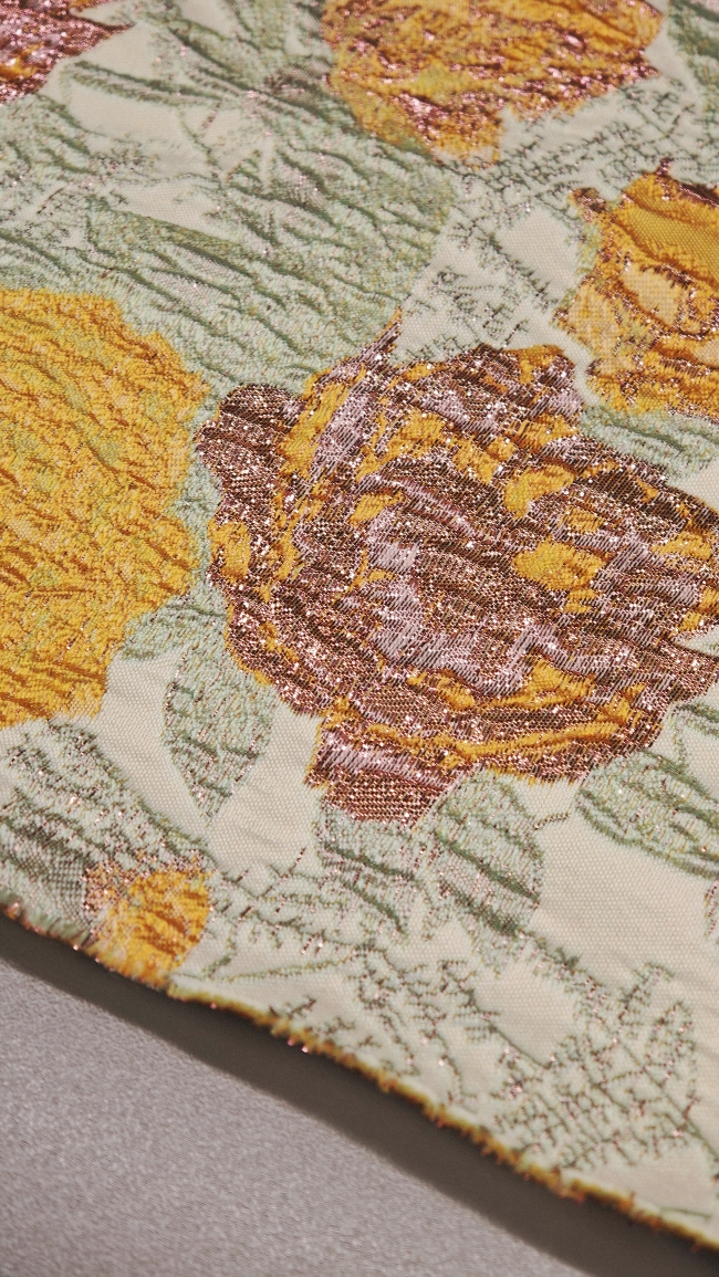 Ovaj luksuzni obostrani žakard oduševljava bogatim motivom zlatno-žutih i bakrenih ruža koji stvara prekrasan 3D efekt. Tkanina je mekana na dodir, lagano strukturirana i jednako atraktivna s obje strane, što omogućuje kreativnost pri šivanju.