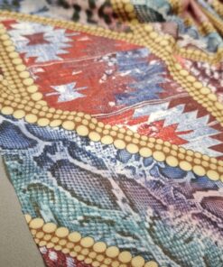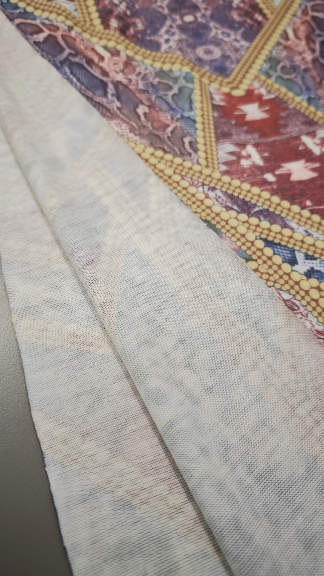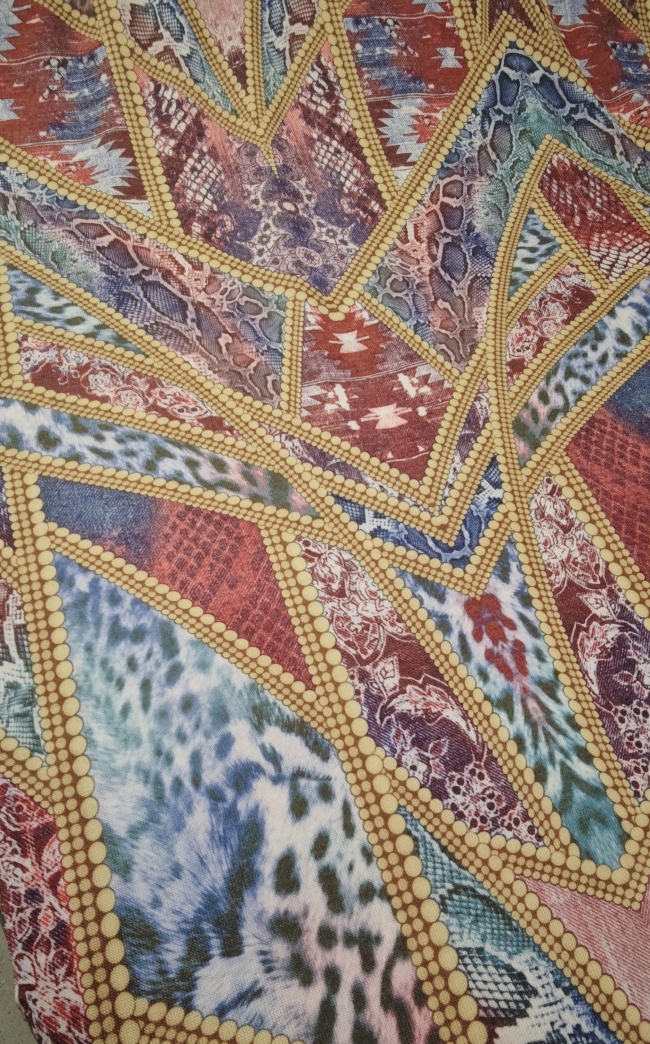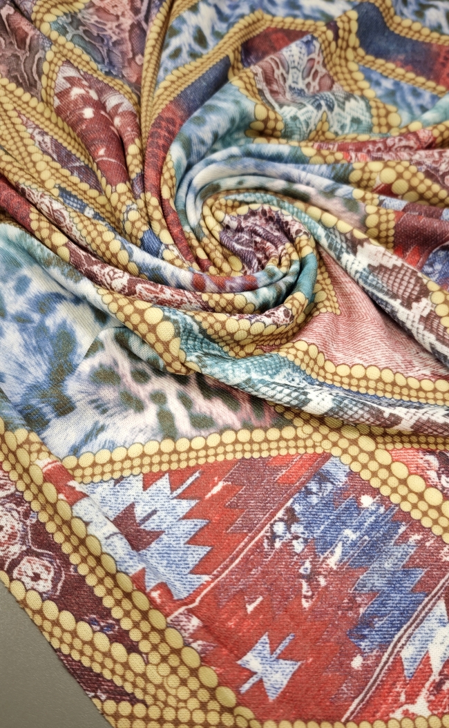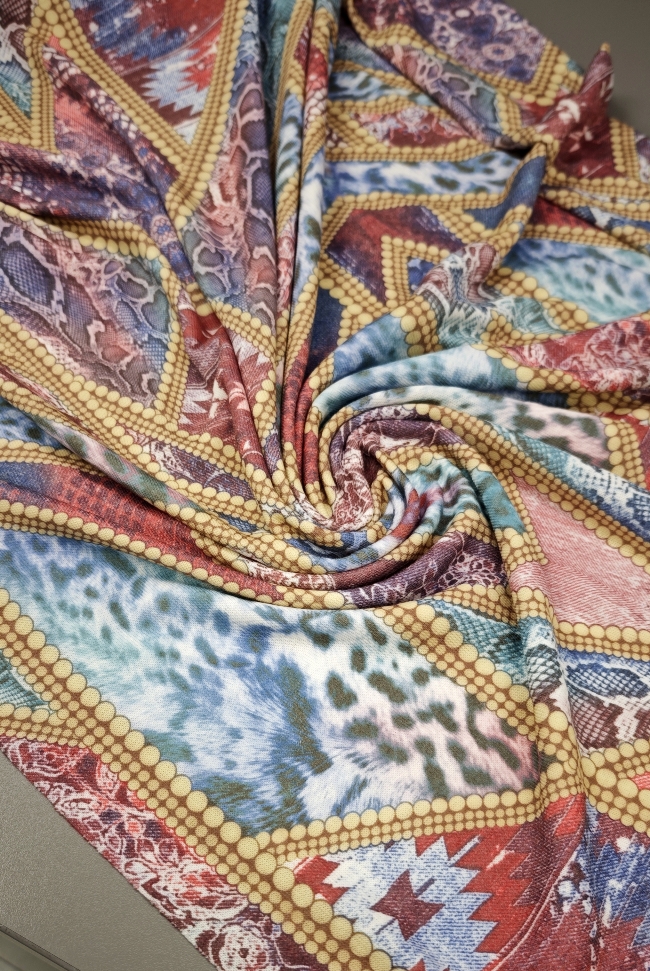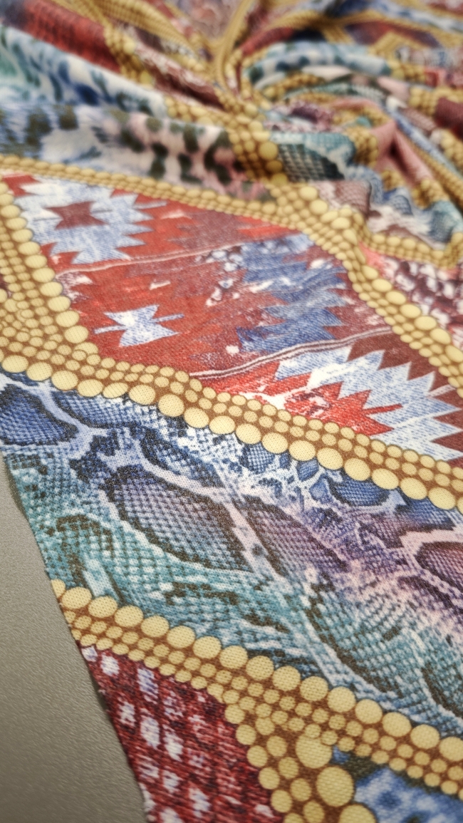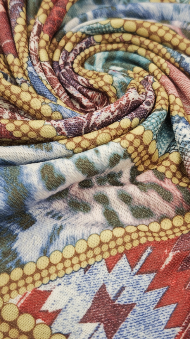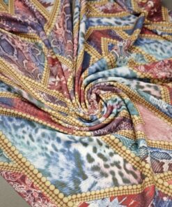 Ovaj modni viskozni jersey ističe se izražajnim višebojnim tiskom koji odmah privlači pažnju i daje tkanini snažan, moderan izgled. Mekan je, gladak i ugodan na dodir, s lijepim padom koji prirodno prati liniju tijela. Materijal je prozračan i lagan, što ga čini idealnim izborom za svakodnevno nošenje, ali i za upečatljive modne komade.