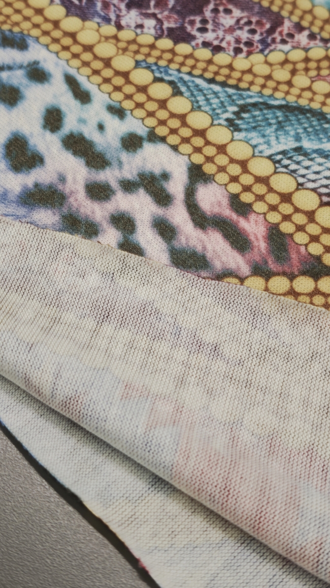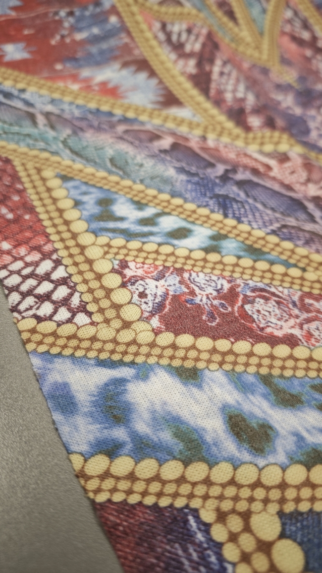 Viskoza osigurava osjećaj svježine i udobnosti, dok jersey struktura daje elastičnost i fleksibilnost, potrebnu za odjeću koja mora biti praktična i nosiva. Višebojni tisak omogućuje jednostavno kombiniranje s jednobojnim materijalima i savršeno dolazi do izražaja na modernim krojevima.