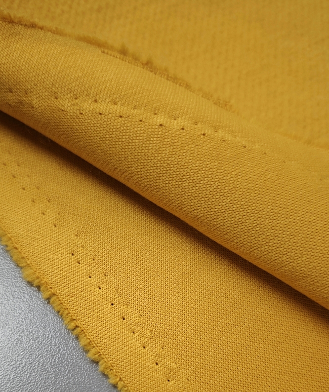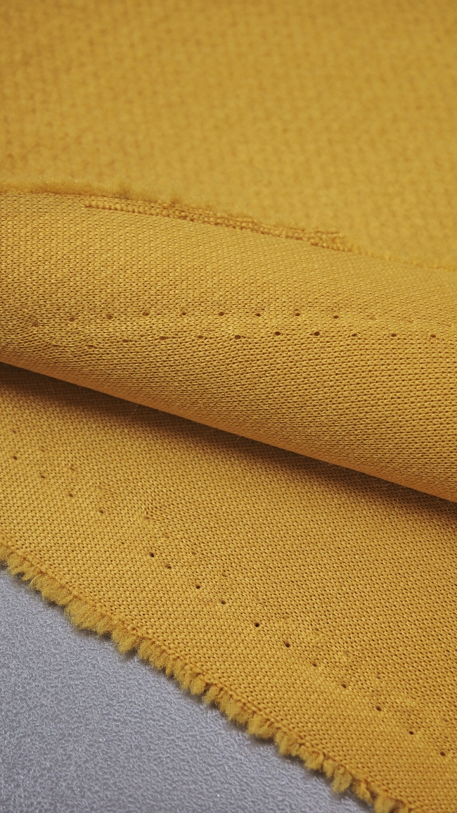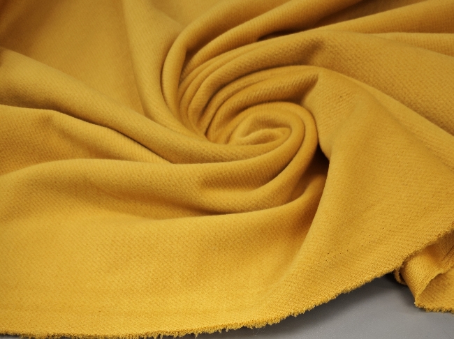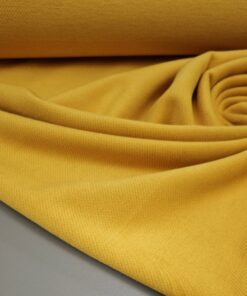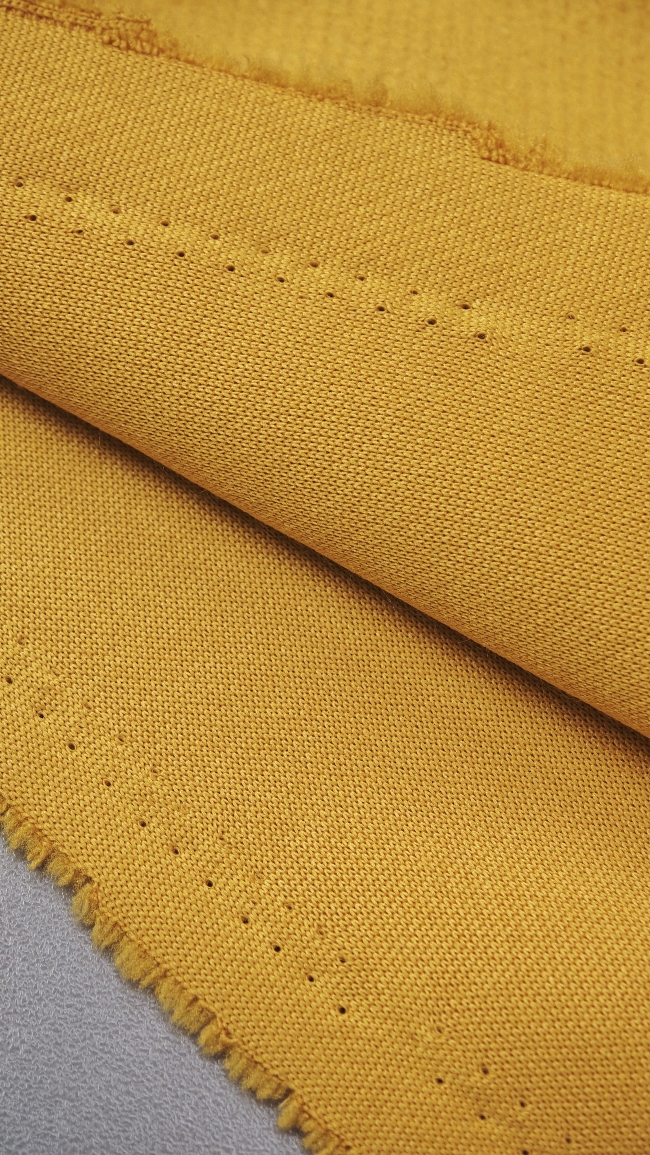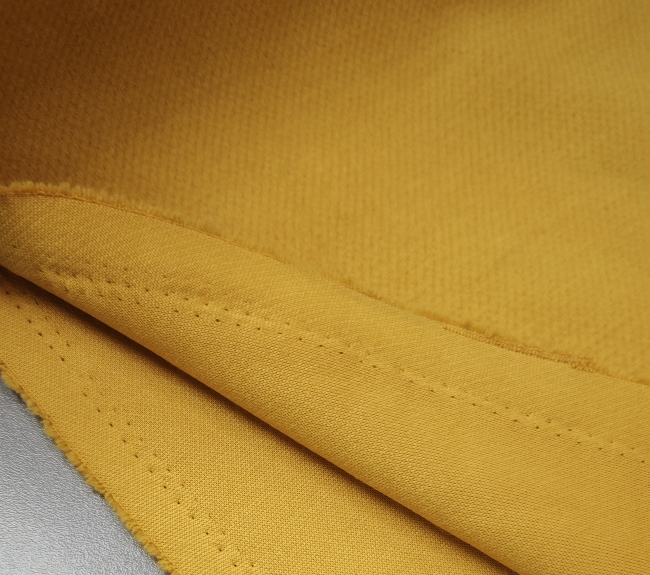 Oker kaputna tkanina s mekanim dodirom i ugodnom elastičnošću donosi toplinu, stabilnost i uredan izgled. Gusta i kompaktna površina omogućuje precizne krojeve, lijep pad i čvrstu formu. Materijal je pogodan za modele koji zahtijevaju toplinu, strukturu i diskretnu elastičnost.