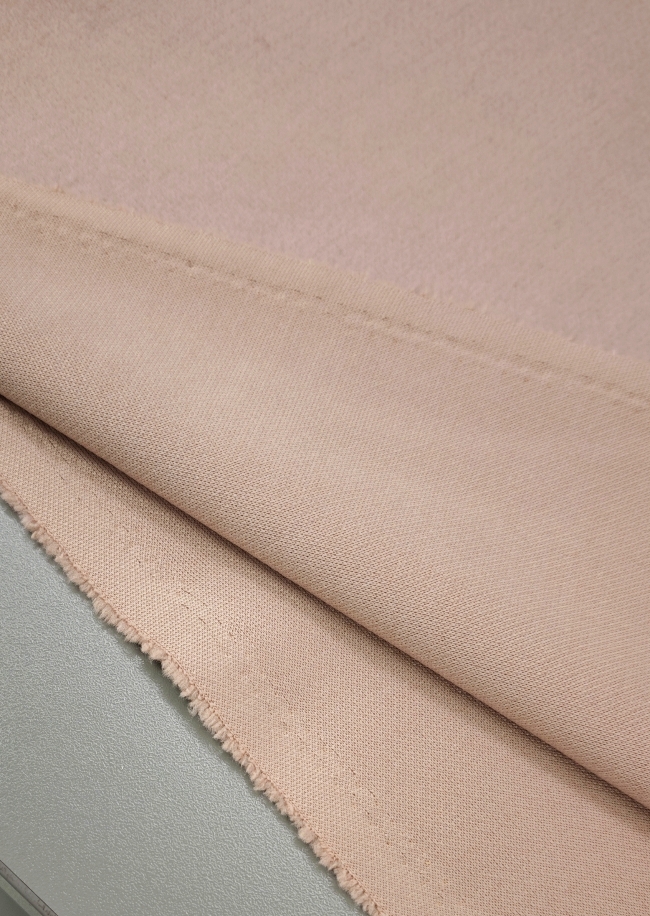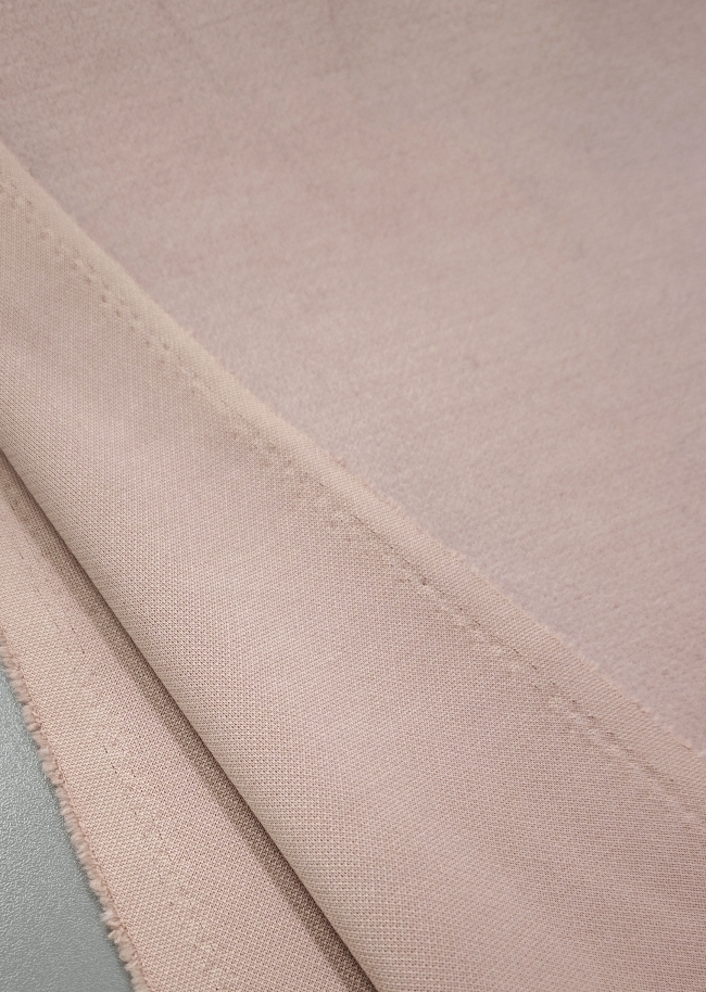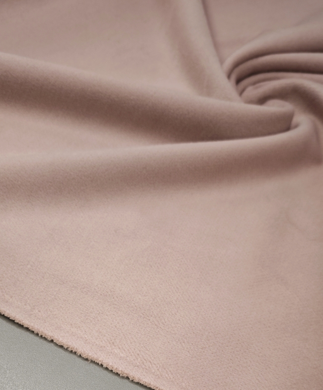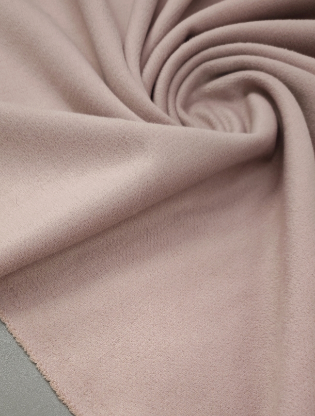 Topla, kompaktna i ugodno mekana tkanina u pudrasto roza nijansi, namijenjena izradi kaputa, jakni i prsluka. Materijal ima blagu elastičnost koja omogućuje bolju prilagodbu kroju, veću udobnost pri nošenju i stabilan izgled gotove odjeće. Površina je glatka i fina na dodir, dok gusto tkanje osigurava osjećaj kvalitete i trajnosti, idealno za jesensko-zimske kolekcije.