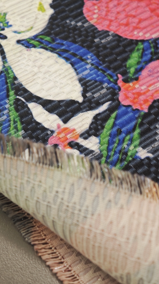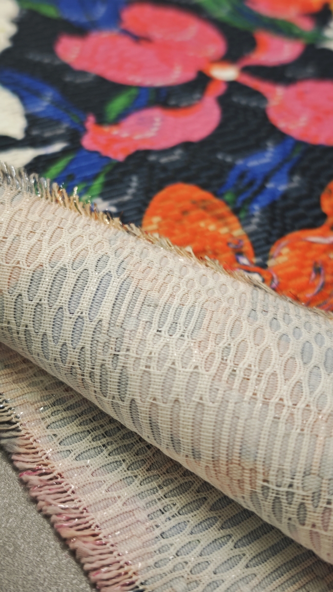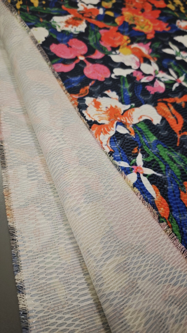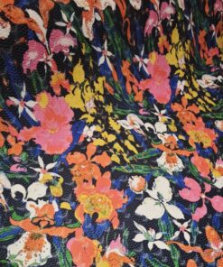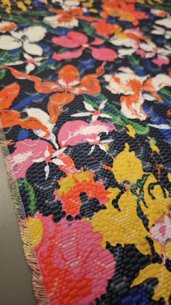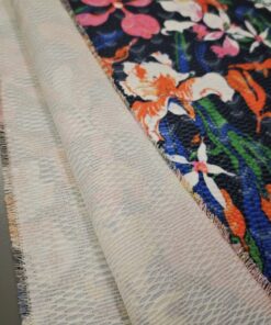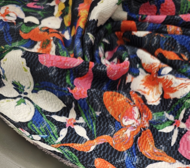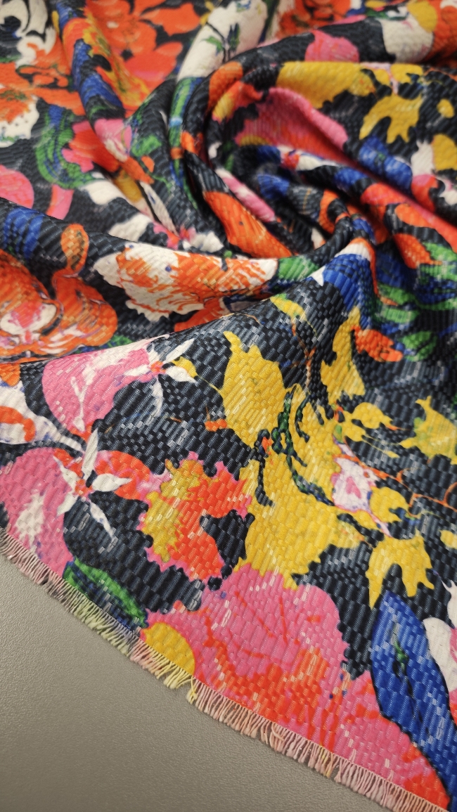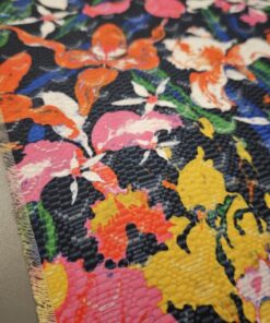 Ova elegantna žakard tkanina savršena je za šivanje haljina, suknji, sakoa i jakni koji privlače pogled. Njezina reljefna 3D struktura i bogat, šareni cvjetni uzorak daju odjeći poseban karakter i luksuzan izgled. Tkanina je stabilna, ali ugodno meka, što omogućuje lijepo formiranje krojeva i udobno nošenje.
