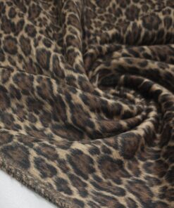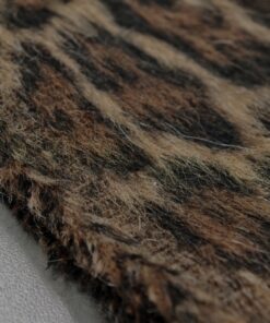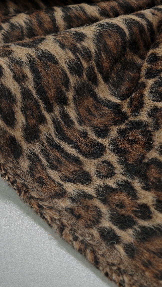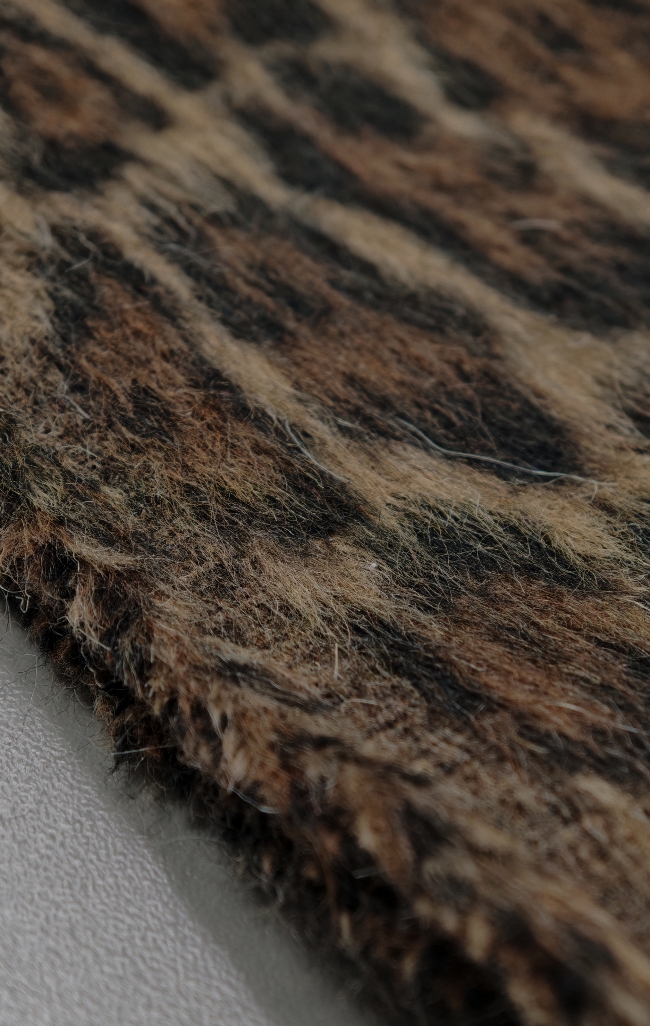 Savana Leopard je izražajno umjetno krzno s gustim, punim florom i jasno definiranim leopard uzorkom u toplim smeđim nijansama. Površina je bogata, voluminozna i vizualno vrlo bliska pravom krznu, s ravnomjerno raspoređenim vlaknima koja daju snažan, luksuzan izgled.