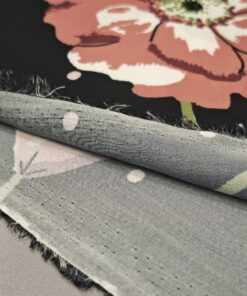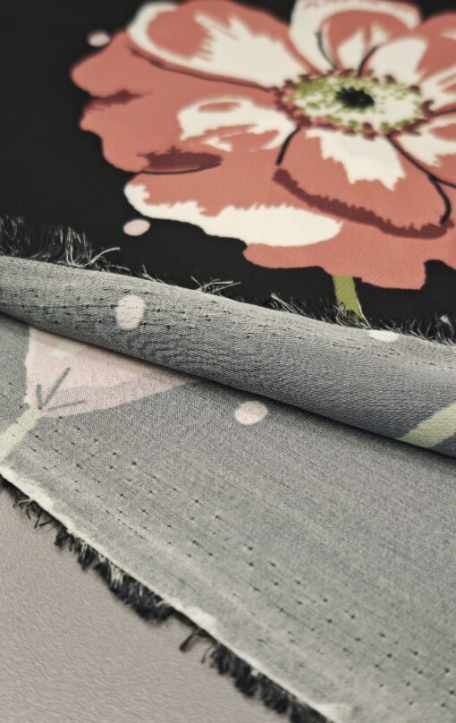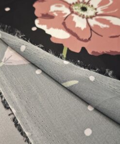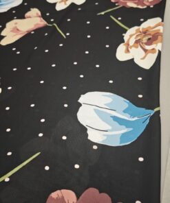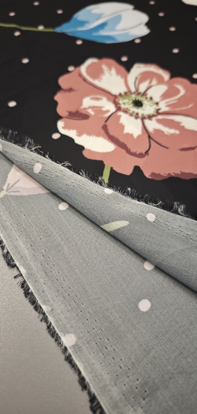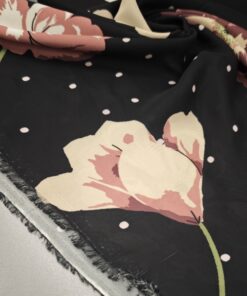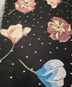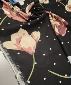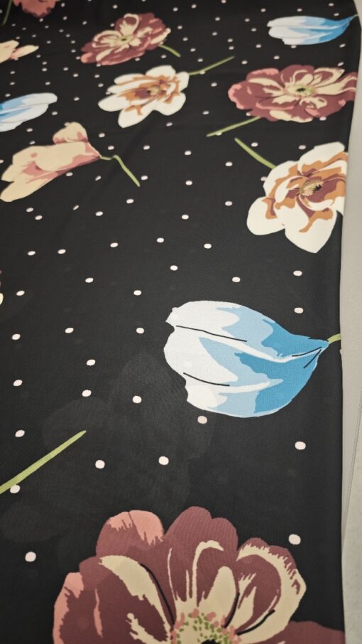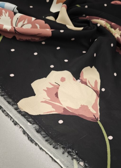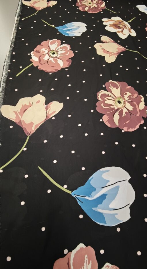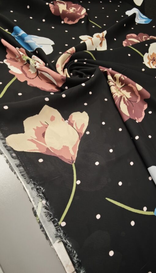 🌷 Lagano proziran crni žoržet s tulipanima i točkicama – moderna tkanina (120 g/m²) 1 kg / 19,90 €