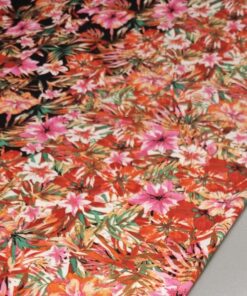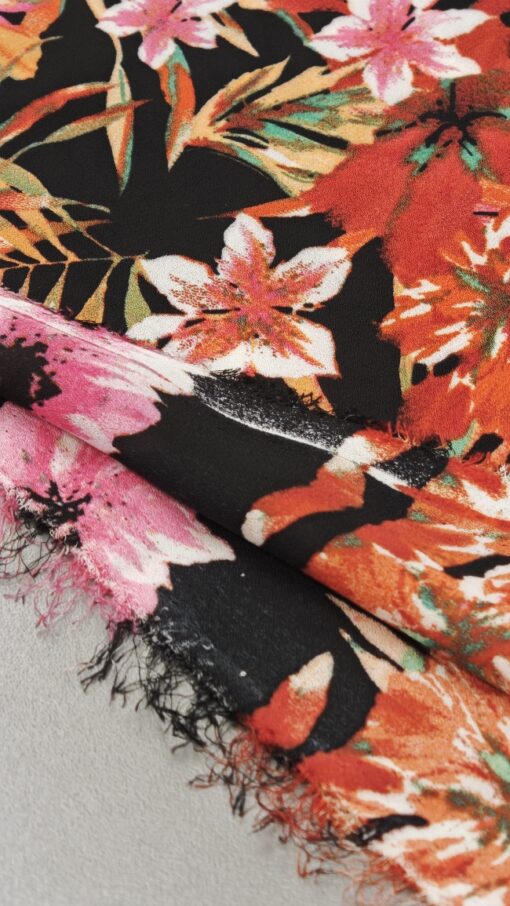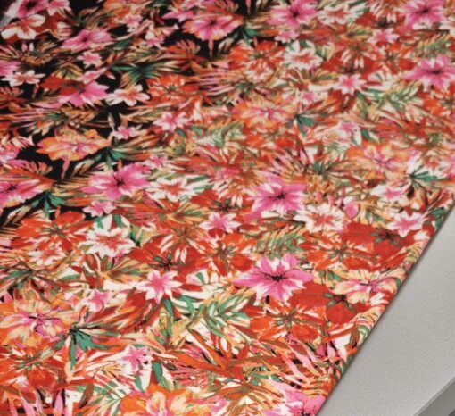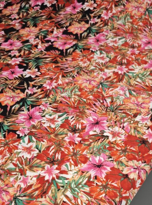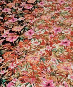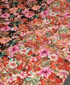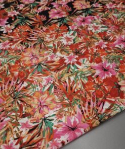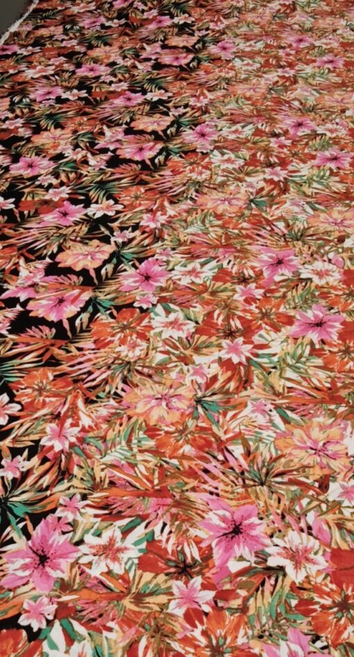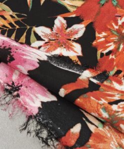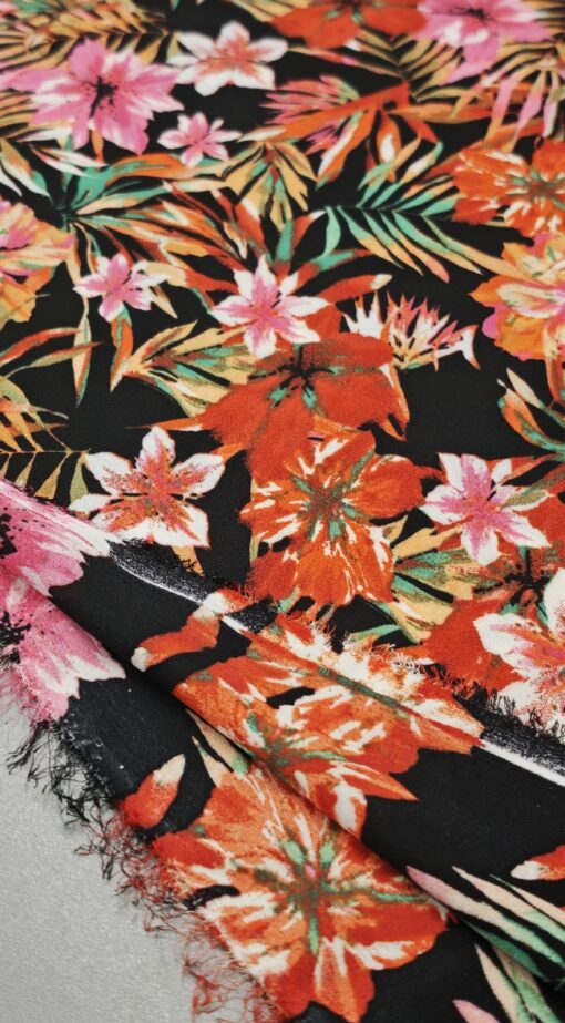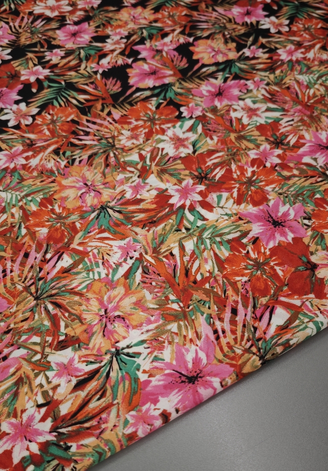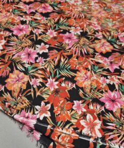 Ovaj neprozirni Tropicana žoržet donosi živahne motive tropskog cvijeća s efektom cvjetne bordure. Tkanina je lagana, ugodna na dodir i lijepo pada, što je čini odličnim izborom za haljine, bluze, tunike, paree i ljetne modne dodatke.