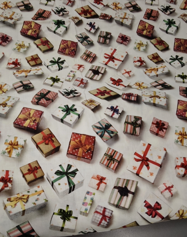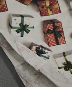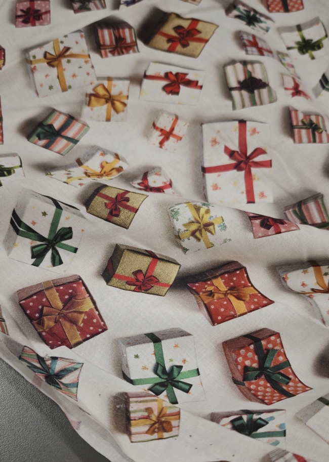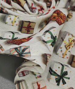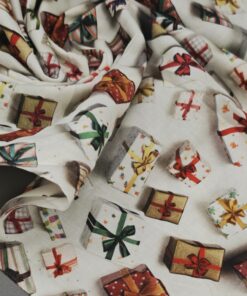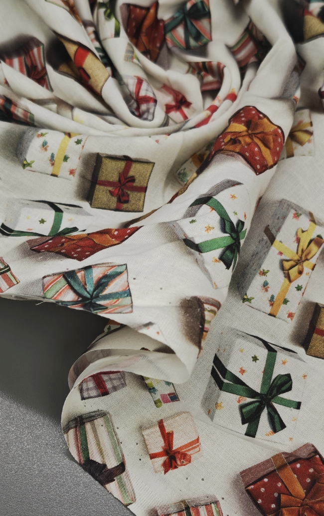 Ovaj svečani popelin na natur bijeloj podlozi s sitnim motivom darilaca savršen je izbor za blagdansko šivanje. Ugodan je na dodir, lagan za rad i dovoljno stabilan da lijepo drži formu — idealan za blagdanske košulje, pidžame, dječju odjeću, suknje, stolnjake, salvete, ukrasne vrećice za poklone i sav ostali božićni dekor.