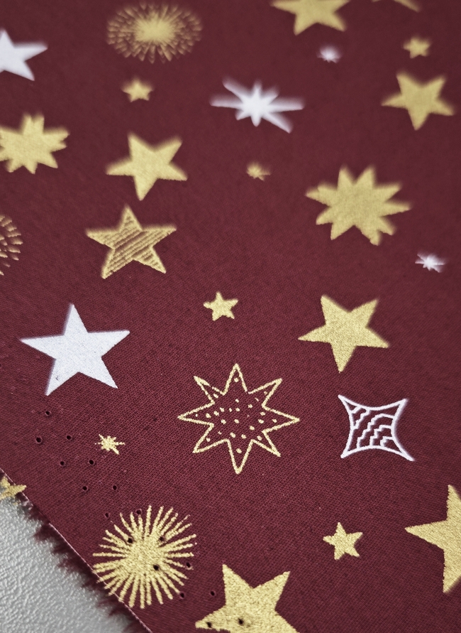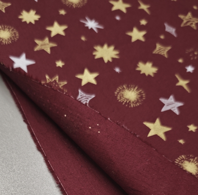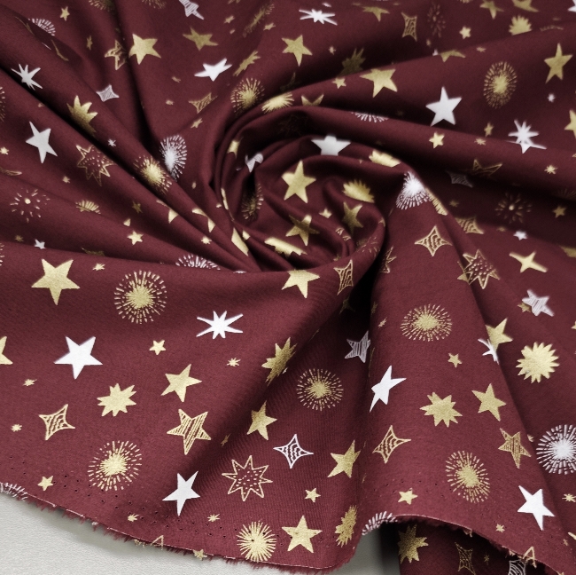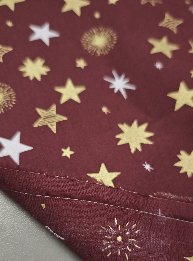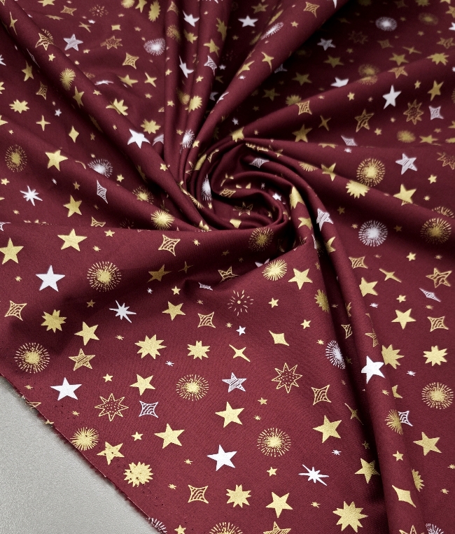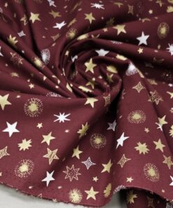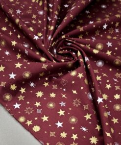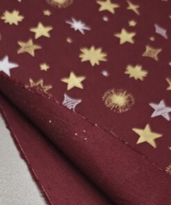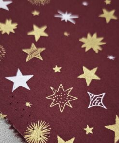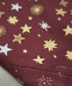 Ovaj svečani poplin u bogatoj bordo boji sa zlatnim zvijezdama savršen je izbor za sve koji žele stvoriti tople i atraktivne blagdanske kreacije. Materijal je ugodan na dodir, lako se kroji i nosi, pa je idealan za šivanje božićnih haljina, suknji, košulja, dječje odjeće, kompleta za blagdanska fotografiranja te dekor za dom poput navlaka, traka, ukrasnih detalja i stolnih dekoracija.