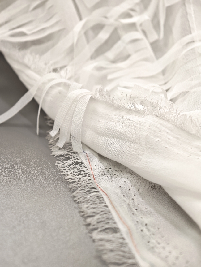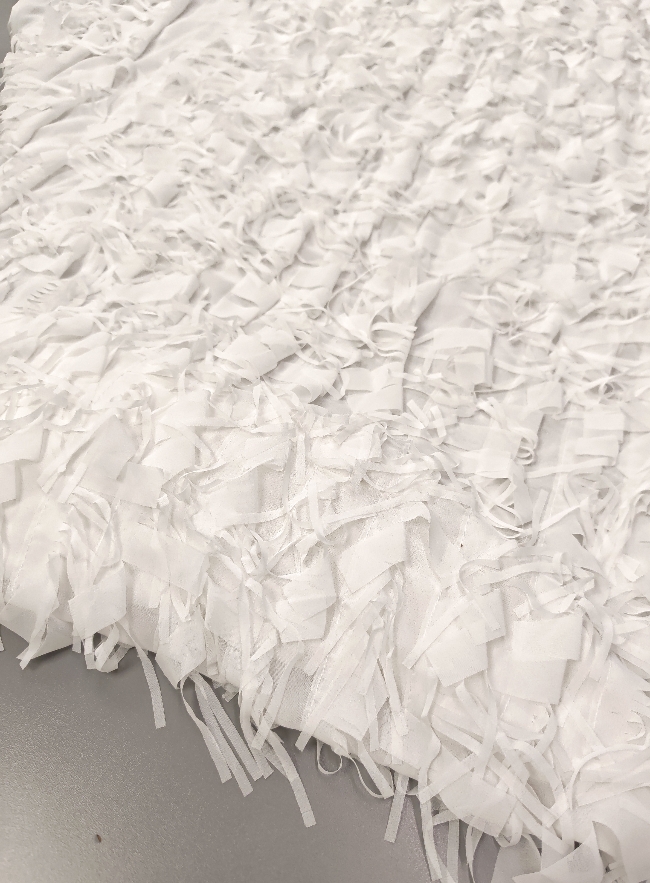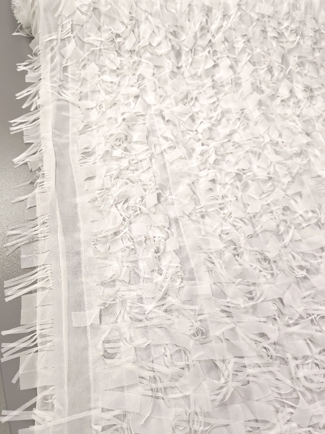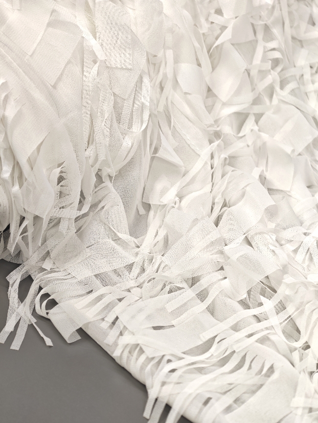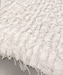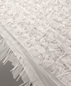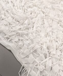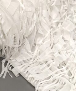 Svečani bijeli žoržet s bogatim 3D reljefom i diskretnim resicama koje daju dubinu i luksuzan izgled. Površina je vizualno razigrana, ali elegantna, s naglašenom teksturom koja odmah privlači pažnju. Idealan materijal za svečane haljine, večernje kombinacije, modne detalje i posebne komade gdje je cilj efektan, profinjen izgled. Tkanina djeluje lagano, dekorativno i izrazito svečano