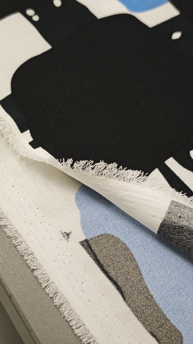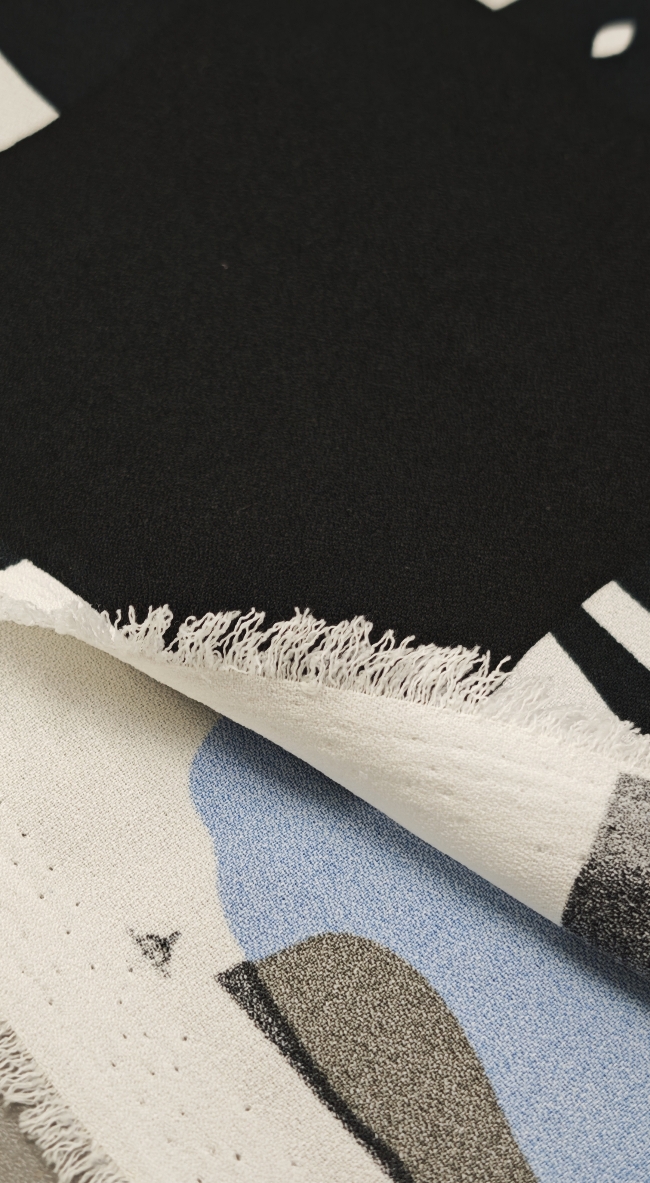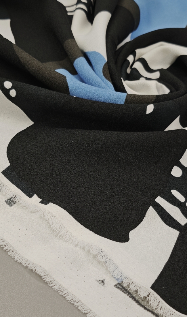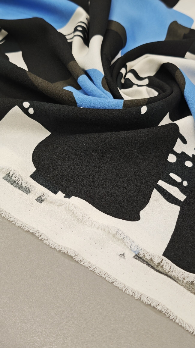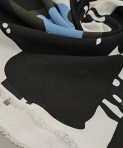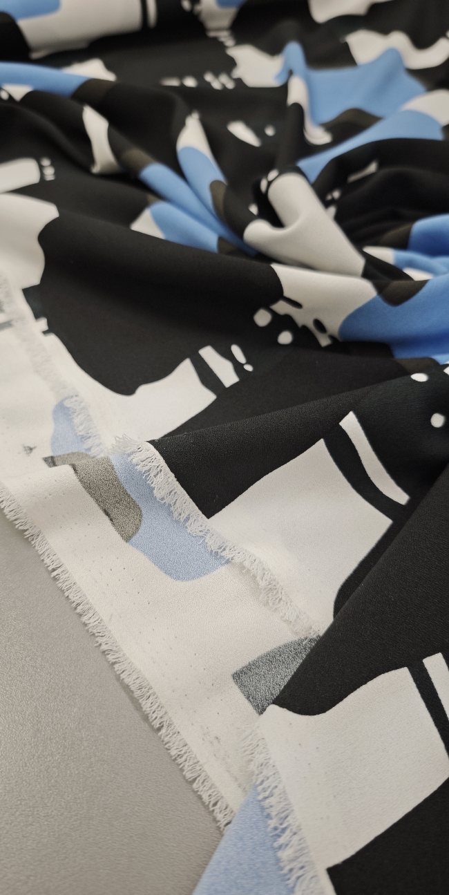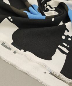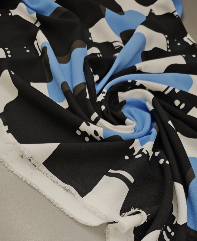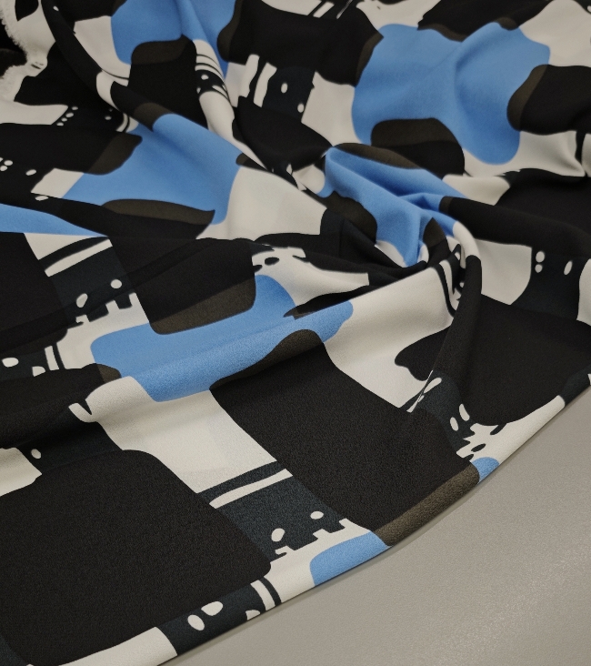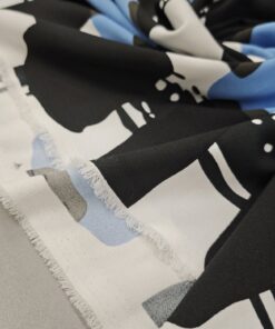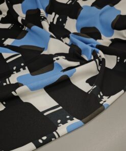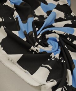 Ova atraktivna modna tkanina u kombinaciji plave i crne boje s geometrijskim uzorkom donosi svježinu i dinamiku svakoj kreaciji. Lako se oblikuje, udobna je za nošenje i zahvaljujući svojoj srednjoj težini (140 g/m²) idealna je za šivanje haljina, bluza, košulja, suknji i laganih modnih dodataka.