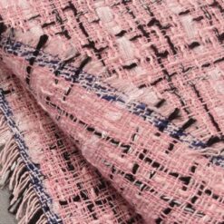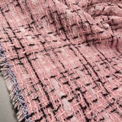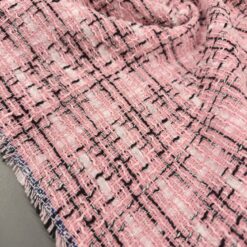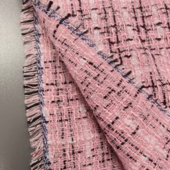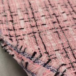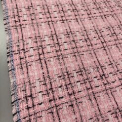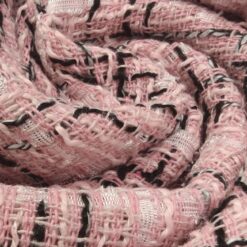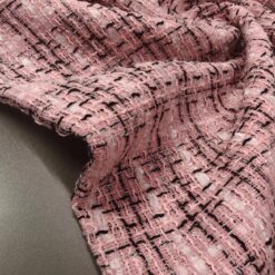Ovaj visokokvalitetni buklé s prepoznatljivom teksturom kombinira nježno ružičastu bazu s crnim detaljima za vrlo moderan efekt. Tkanina srednje težine (290 g/m²) odličan je izbor za krojene jakne, odijela ili kapute. Dobro drži oblik, ne gužva se lako i ima vrlo uredan izgled – savršena osnova za modne kreacije s karakterom.