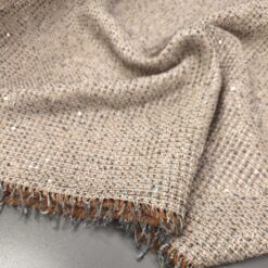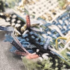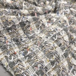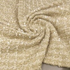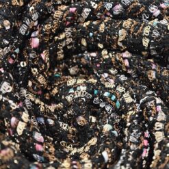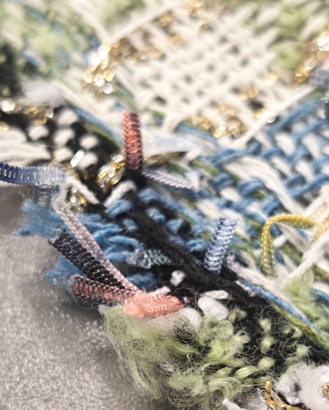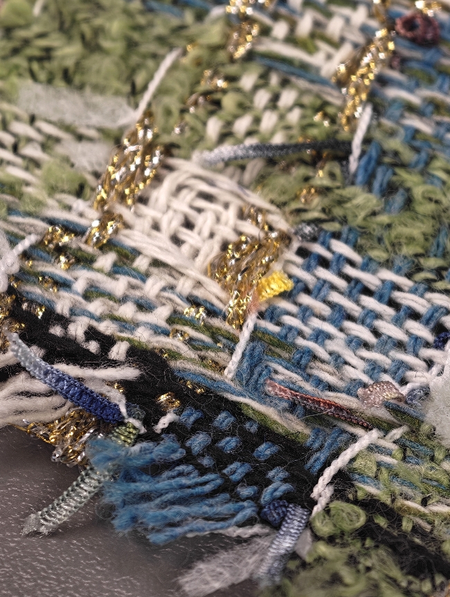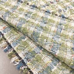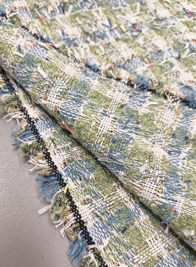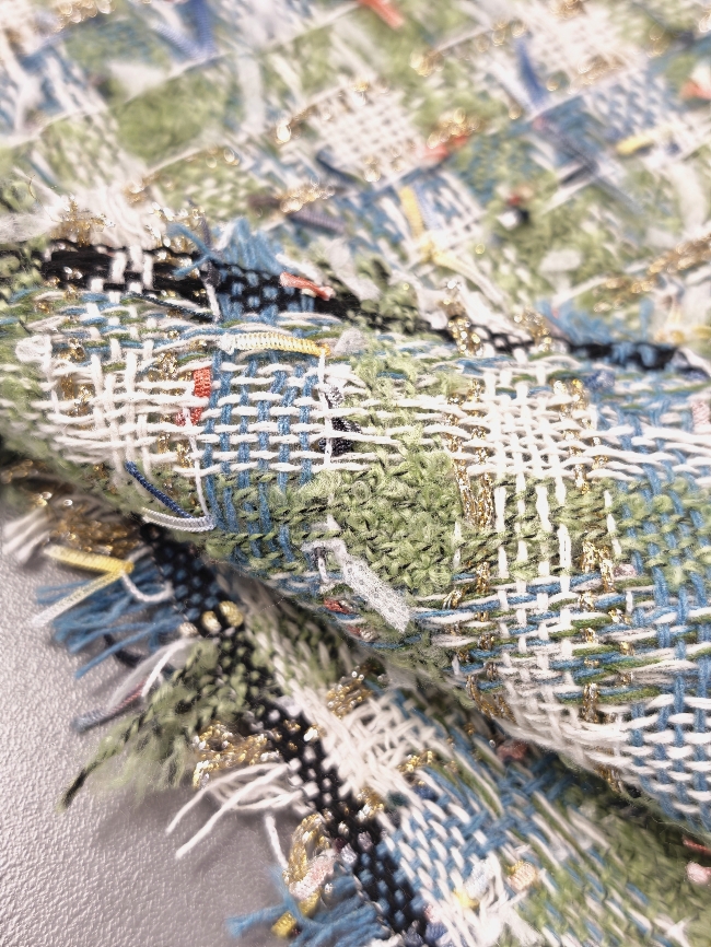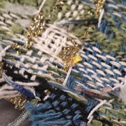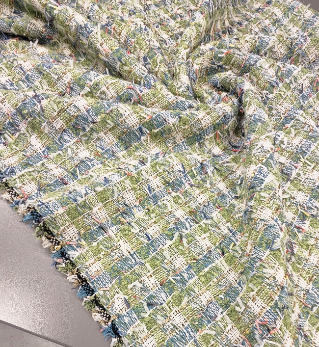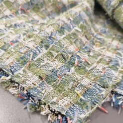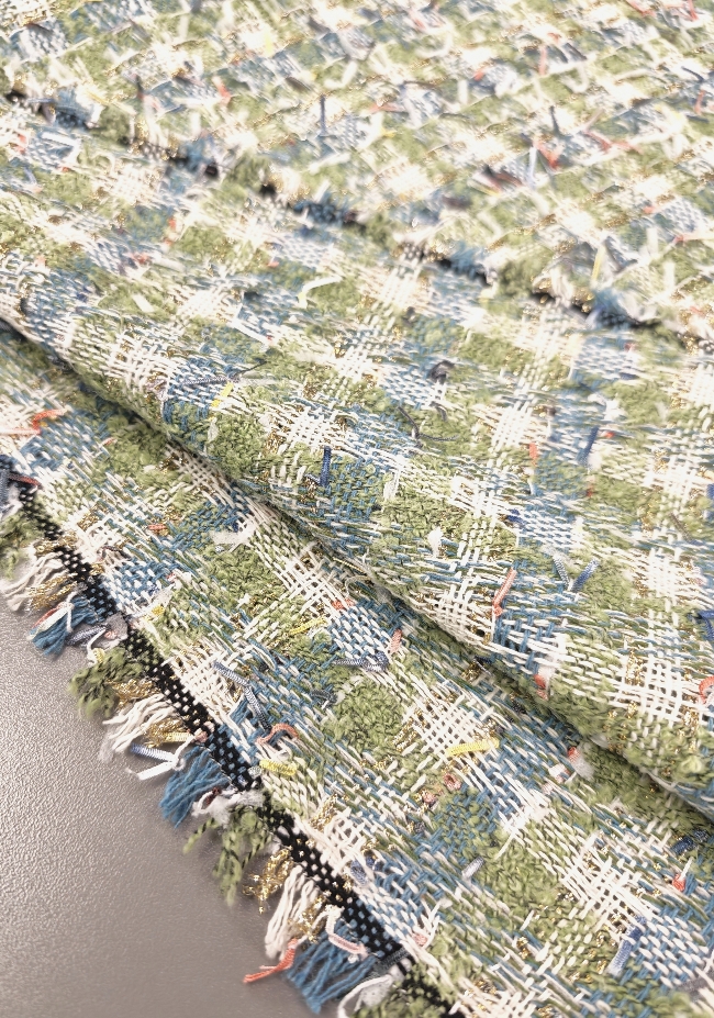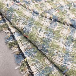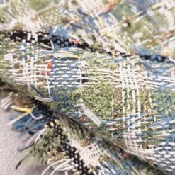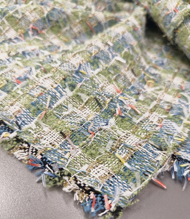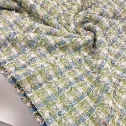 Gusta pamučna bouclé tkanina u plavo-zelenoj boji s finim zlatnim nitima. Karakteristična petljasta struktura daje materijalu bogat izgled, tipičan za Chanel stil.