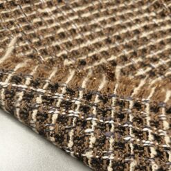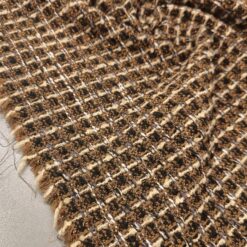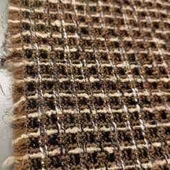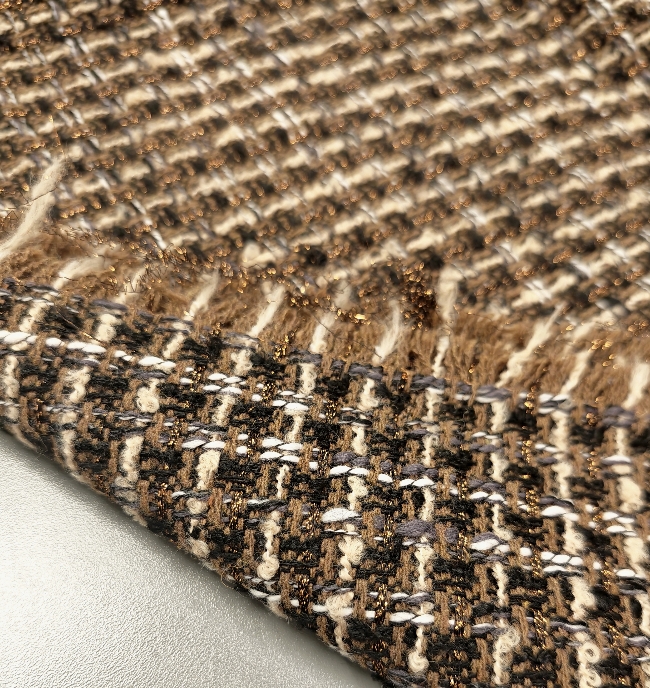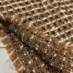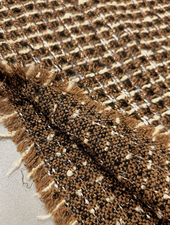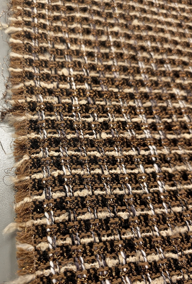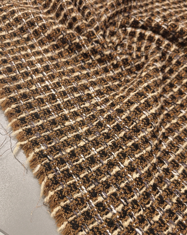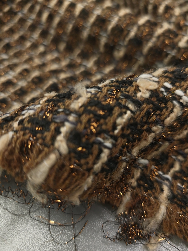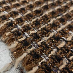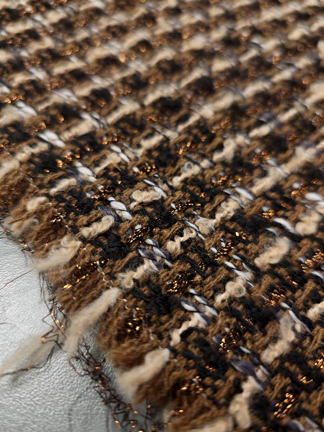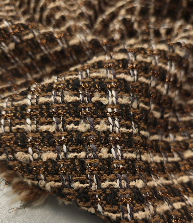 Strukturirani buklé s istaknutim bakrenim nitima koje stvaraju primjetan sjaj i dubinu. Površina je živahna, s karakterističnim petljama i blago neravnom strukturom, što materijalu daje snažan vizualni dojam. Tkanina izgleda kompaktno i puno – prikladno za hladniju sezonu.