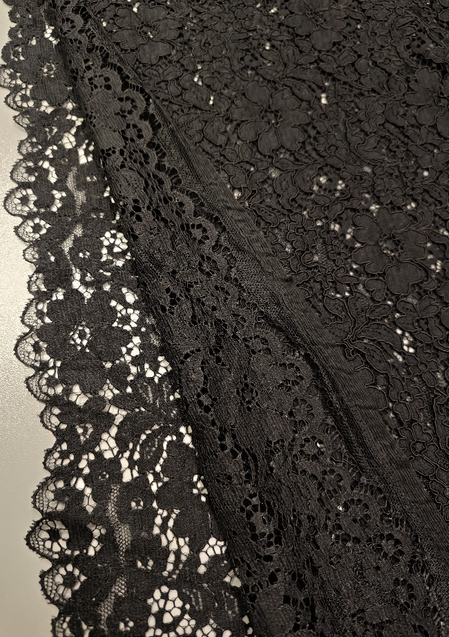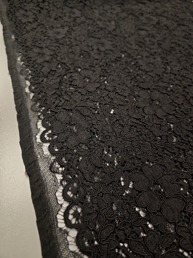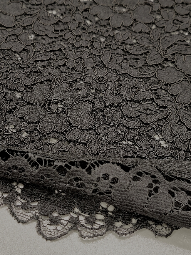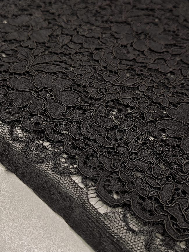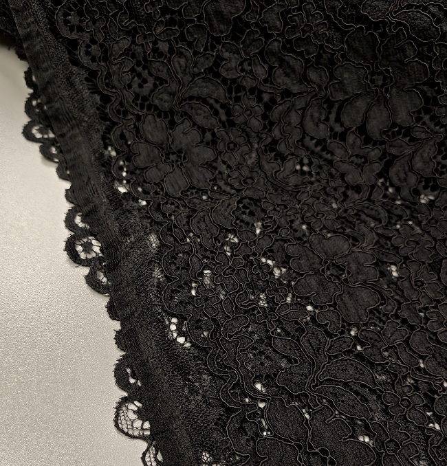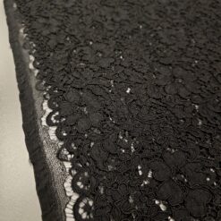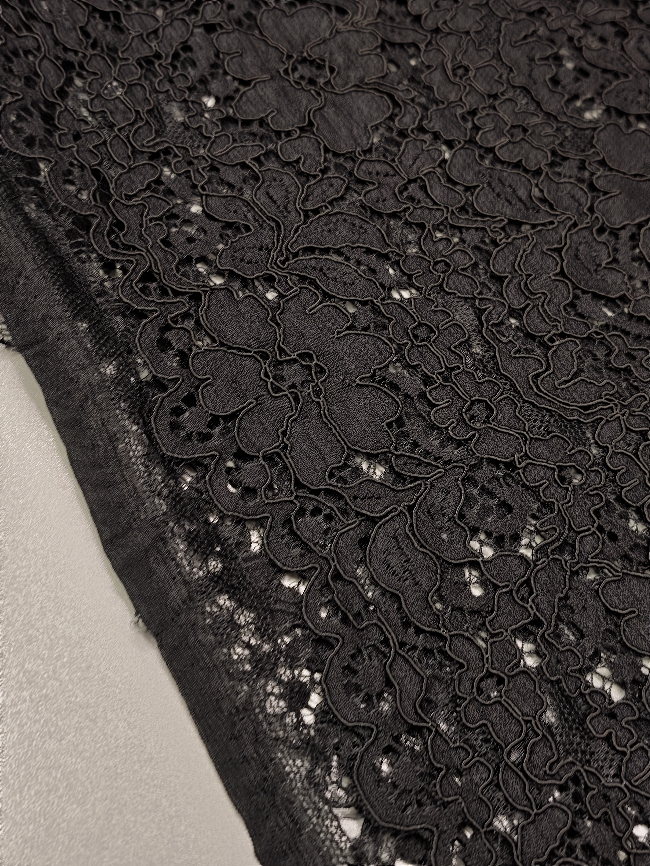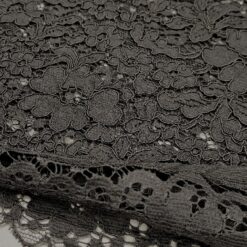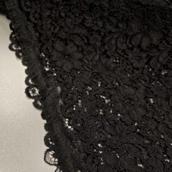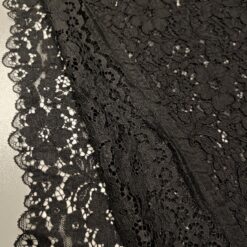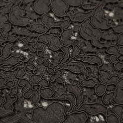 Crna čipka s gustim, bogatim vezom i blagom elastičnošću. Uzorak je pun i izražajan, pa već na prvi pogled ima snažan efekt. Materijal ima kompaktnu strukturu, dok minimalno rastezanje omogućuje bolje pristajanje krojevima odjeće.