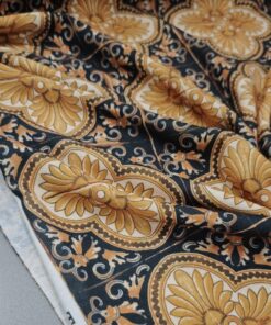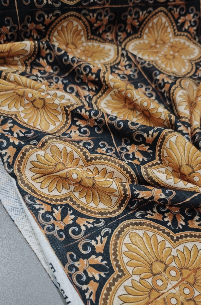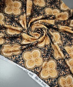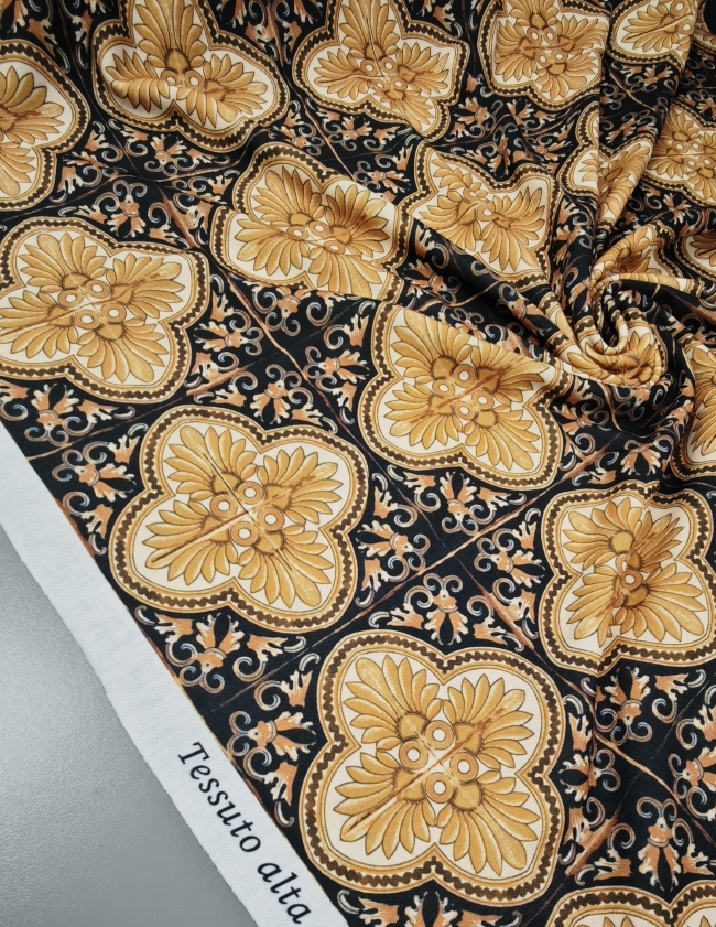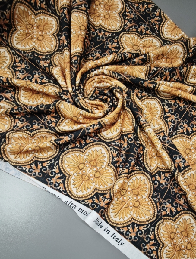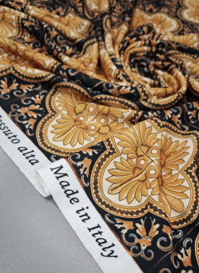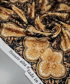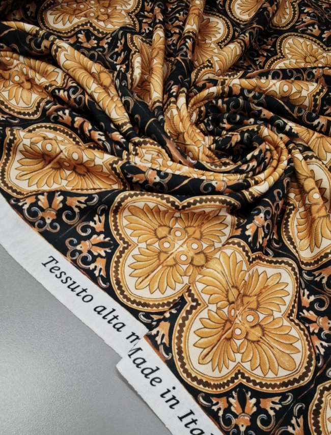 Ovaj mekani, elastični jersey idealan je za haljine, majice, tunike, uske topove, suknje i lagane jaknice. Barok uzorak u zlatnim i tamnim tonovima daje luksuzan, upečatljiv izgled koji podiže svaki kroj.