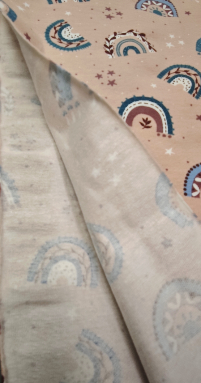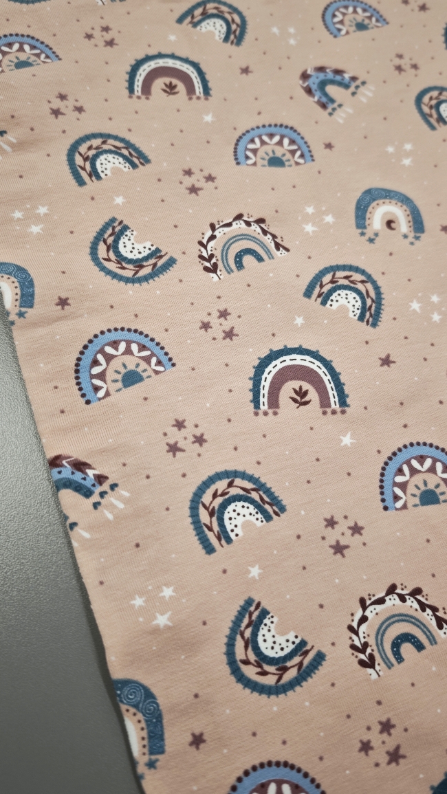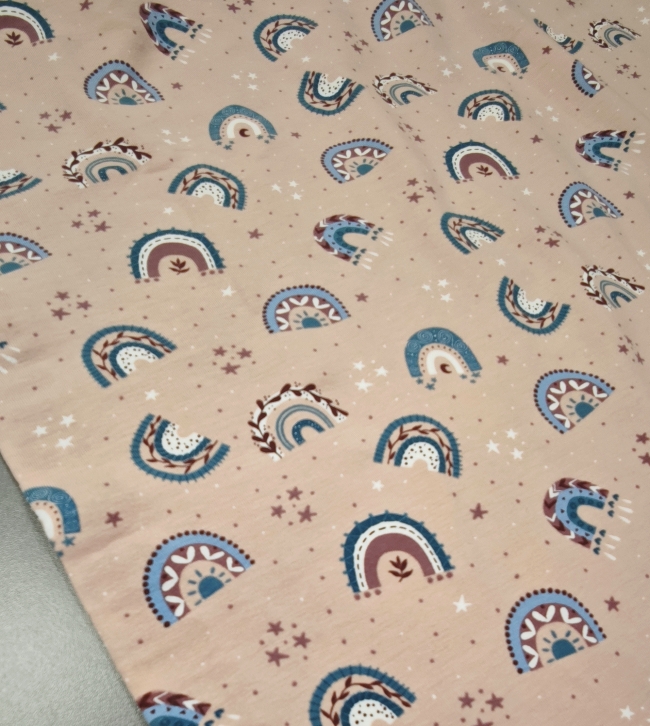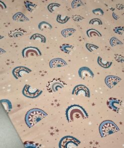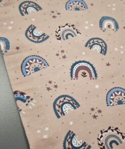 Ovaj nježan, mekan i prozračan pamučni jersey savršen je za udobnu dječju odjeću. Alt roza podloga s boho motivima i sitnim zvjezdicama stvara topao, umirujući izgled koji je idealan za majice, pidžame, haljinice, suknjice, romperiće i lagane hlače.