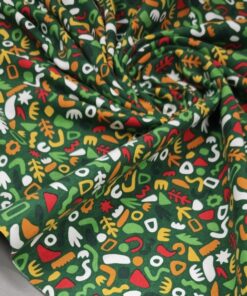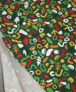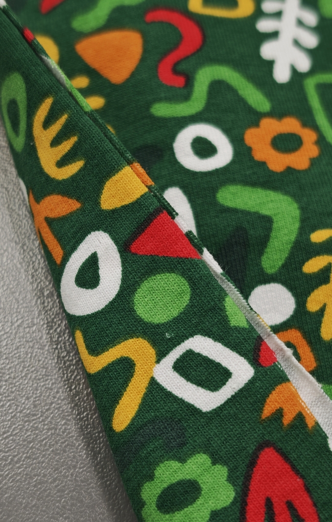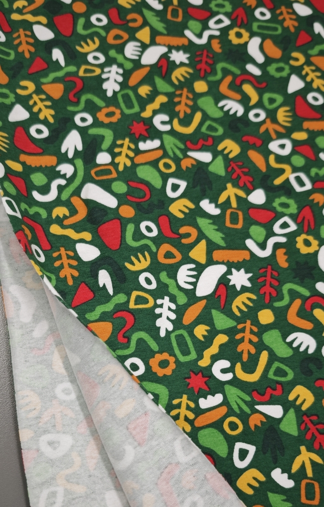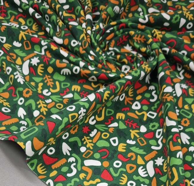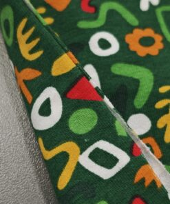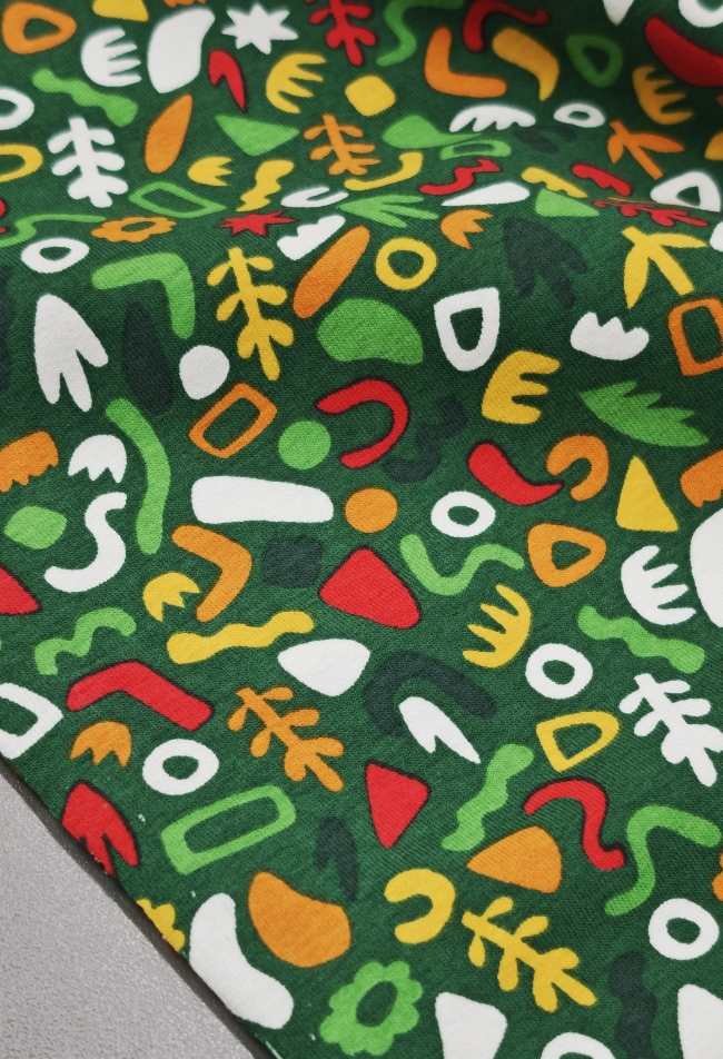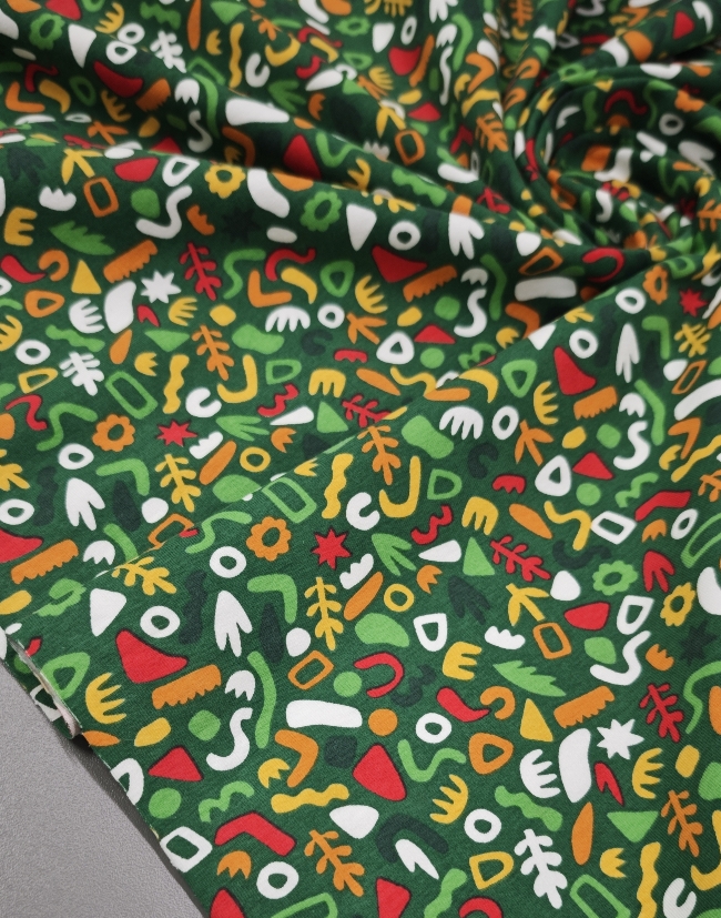 Ovaj mekani pamučni jersey savršen je za svu udobnu dječju odjeću. Razigrani, šareni motiv na zelenoj podlozi daje materijalu veseo i topao izgled, idealan za šivanje majica, pidžama, haljinica, bodija, trenirkica i praktične baby odjeće.
