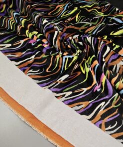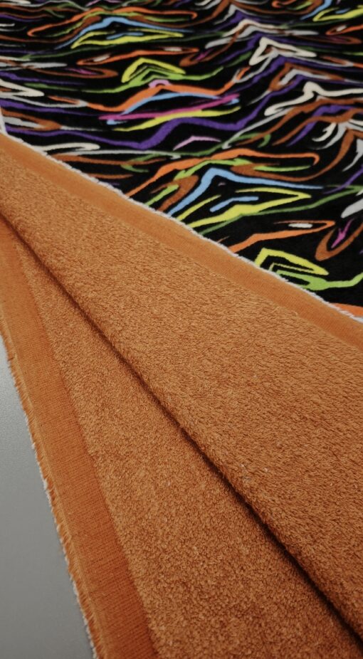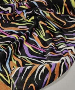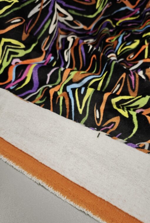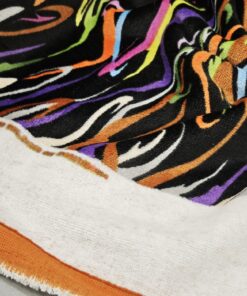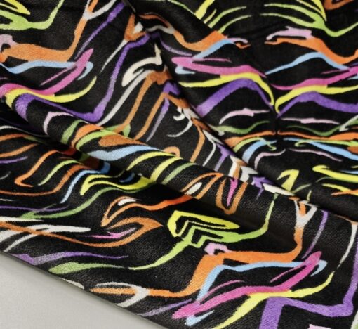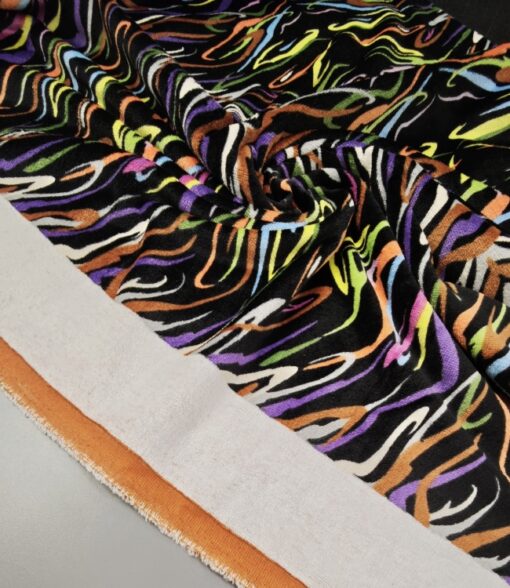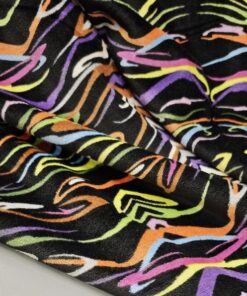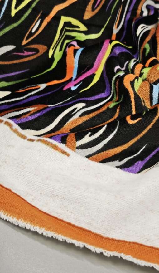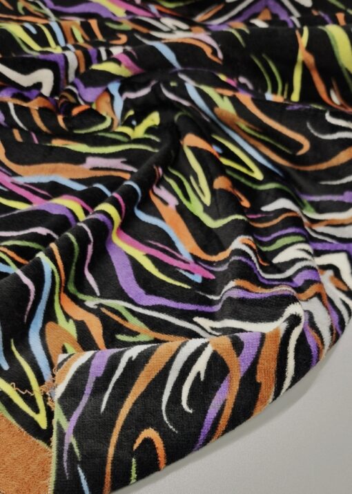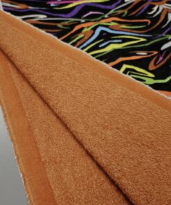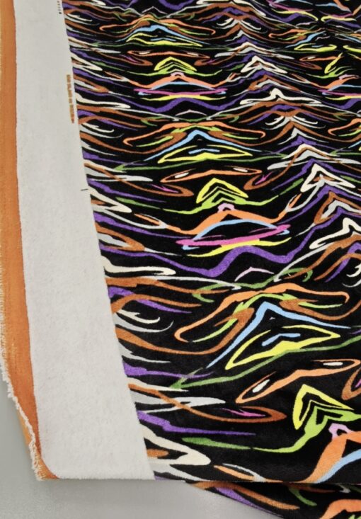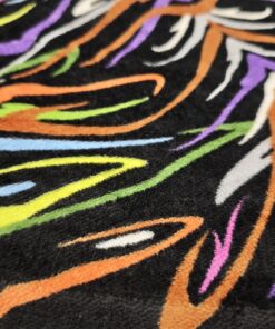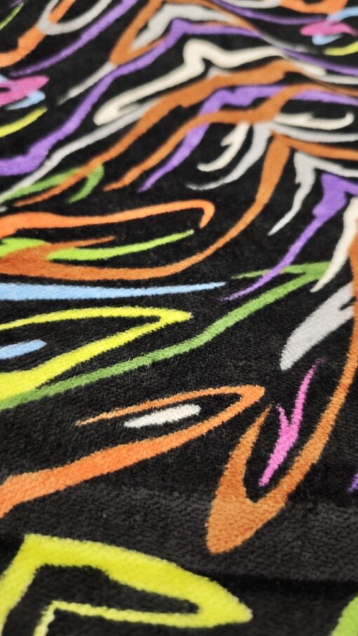 Unikatni frotir “Black Neon” donosi moderan i energičan izgled — crna podloga isprepletena je neonskim valovima boja koji stvaraju upečatljiv kontrast i dojam pokreta. Tkanina je mekana, gusta i izuzetno ugodna na dodir (405 g/m²), s tipičnom zankastom frotirnom strukturom koja daje debljinu i volumen.
