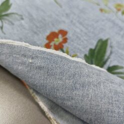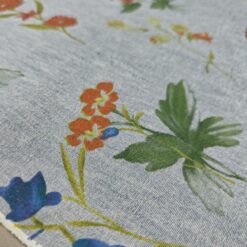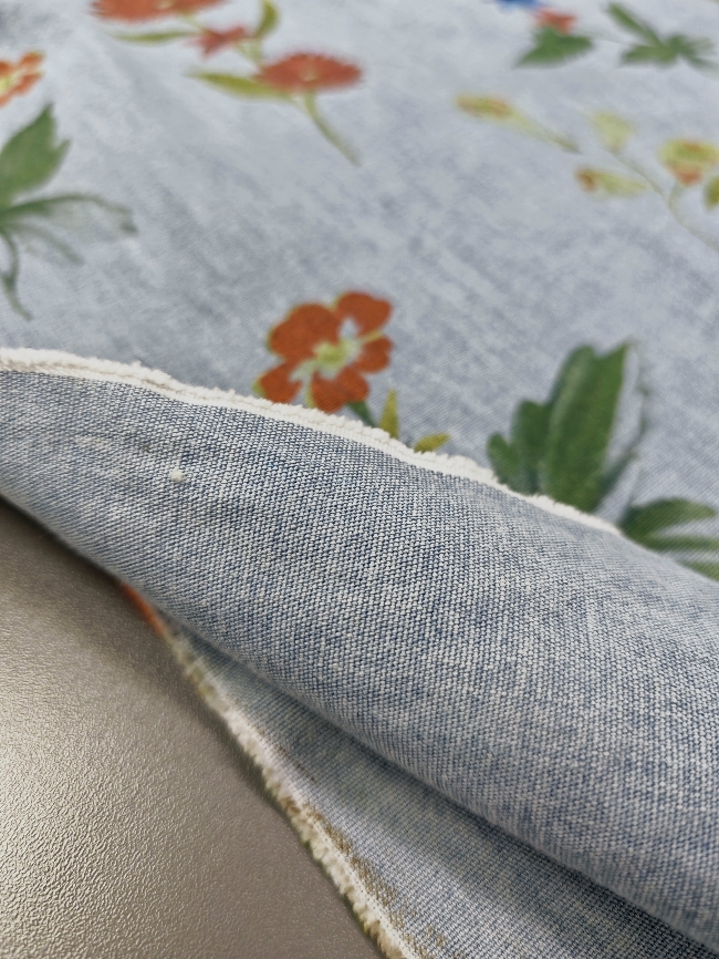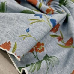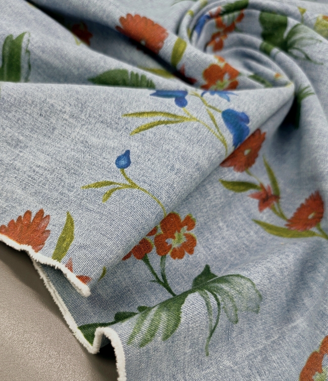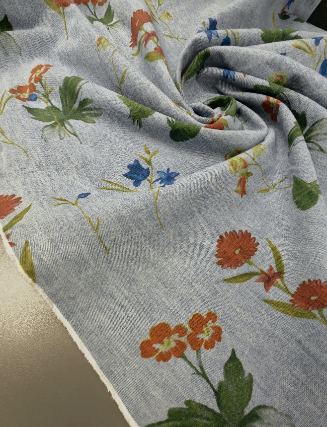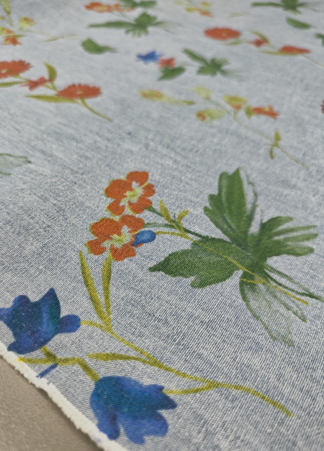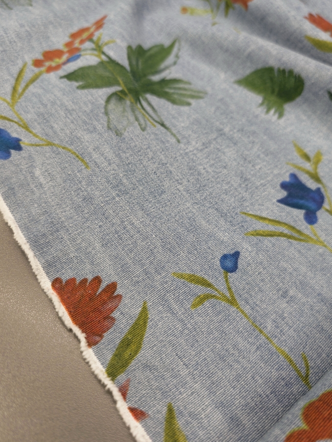 Lagan jeans u svijetloplavoj boji s cvjetnim uzorkom. Ugodan za nošenje i jednostavan za šivanje. Pogodan za hlače, haljine, suknje, košulje i lagane jakne. Uzorak daje svjež, proljetno-ljetni izgled koji se lako kombinira.