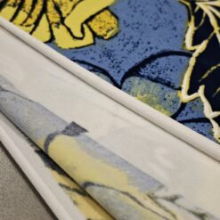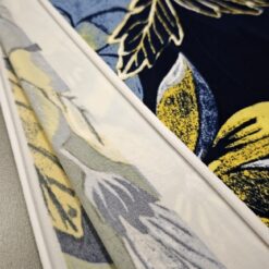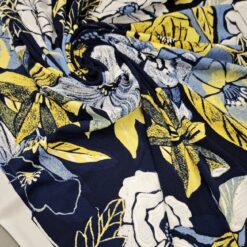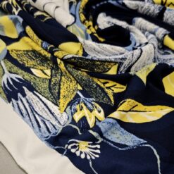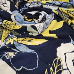 Mekani i udobni jersey s izrazitim cvjetnim motivom na tamnoplavoj pozadini. Žuti i bijeli detalji prekrasno se ističu i stvaraju jasan, uravnotežen kontrast. Tkanina je elastična, lijepo se spušta i udobna je za nošenje tijekom cijelog dana. Pogodna za haljine, tunike, košulje, suknje i lagane tajice. Elegantni izgled s decentnom, ali uočljivom cvjetnom grafikom.