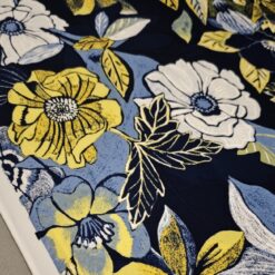 Mekani i udobni jersey s izrazitim cvjetnim motivom na tamnoplavoj pozadini. Žuti i bijeli detalji prekrasno se ističu i stvaraju jasan, uravnotežen kontrast. Tkanina je elastična, lijepo se spušta i udobna je za nošenje tijekom cijelog dana. Pogodna za haljine, tunike, košulje, suknje i lagane tajice. Elegantni izgled s decentnom, ali uočljivom cvjetnom grafikom.