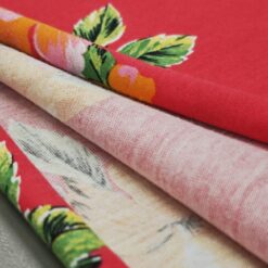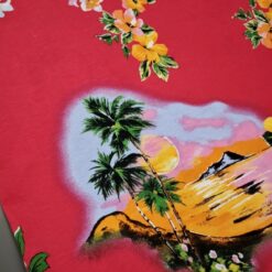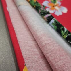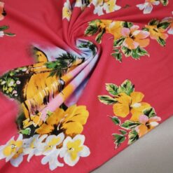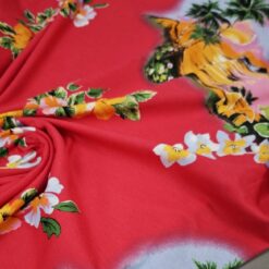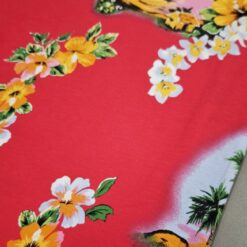 Mekani, elastični pamučni jersey s prepoznatljivim tropskim uzorkom palme na crvenoj pozadini. Tkanina je ugodna na dodir, lijepo se drapira i odlično funkcionira za svakodnevno nošenje. Pogodna za majice, haljine, tunike, dječju odjeću i ljetne setove. Motiv daje osjećaj ljeta, mora i opuštenog havajskog stila.