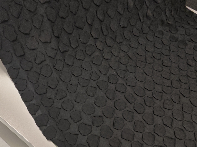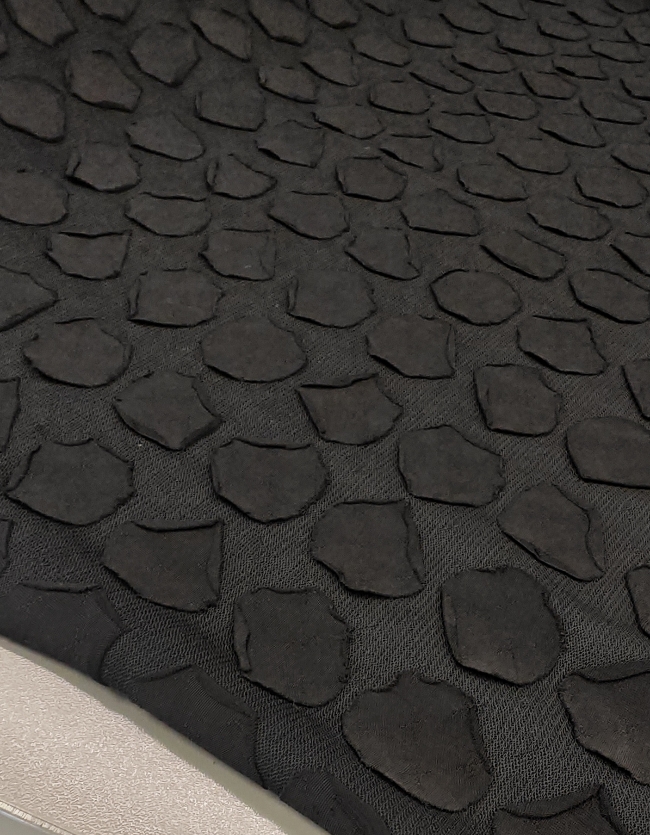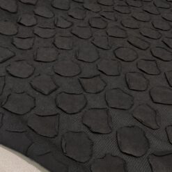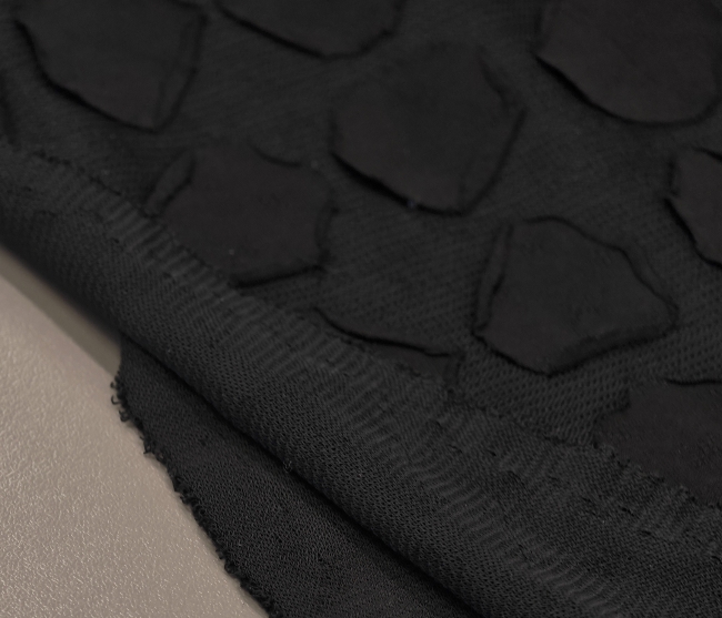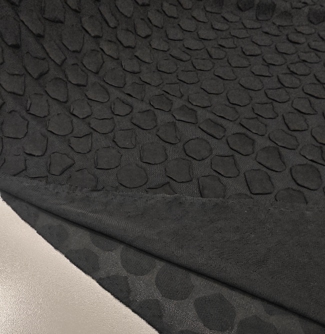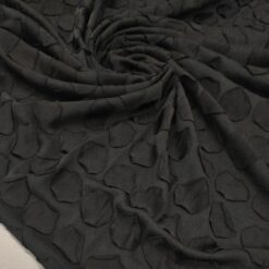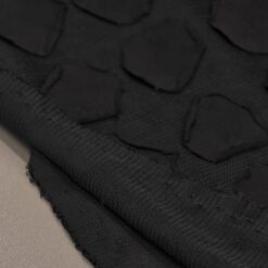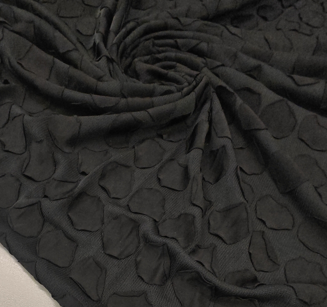 Visokokvalitetni crni jersey s izrazitom 3D reljefnom strukturom koja tkanini dodaje dubinu i poseban vizualni efekt. Materijal je ugodno elastičan, mekan na dodir i prekrasno se drapira, što ga čini vrlo ugodnim za nošenje. Pogodan za majice, haljine, suknje, tajice, lagane kardigane i modne komade kojima je potrebno malo više karaktera. Tkanina se lijepo oblikuje prema tijelu, lako se šiva i pogodna je za svakodnevnu i malo trendi odjeću.