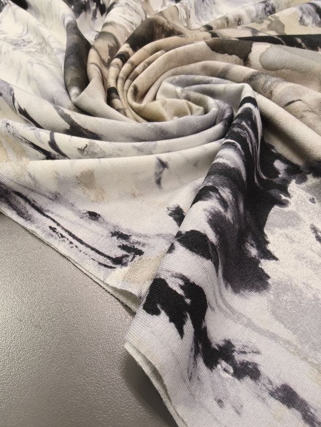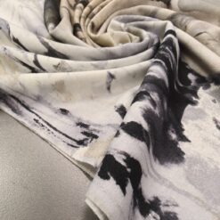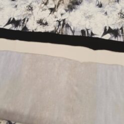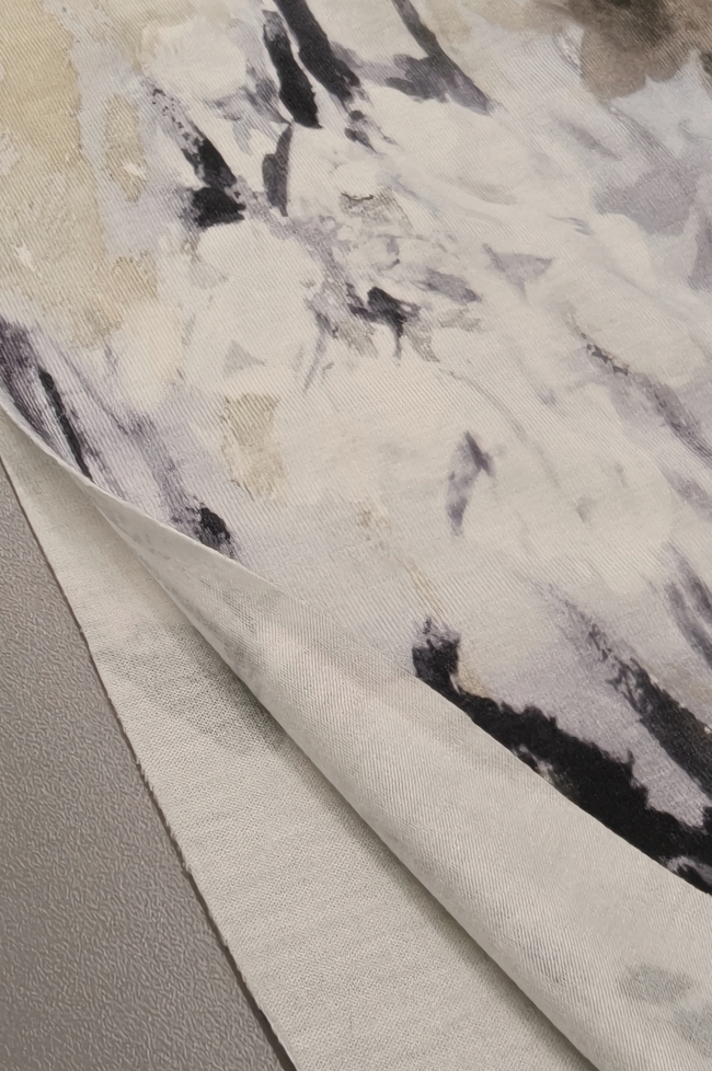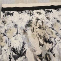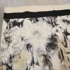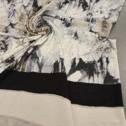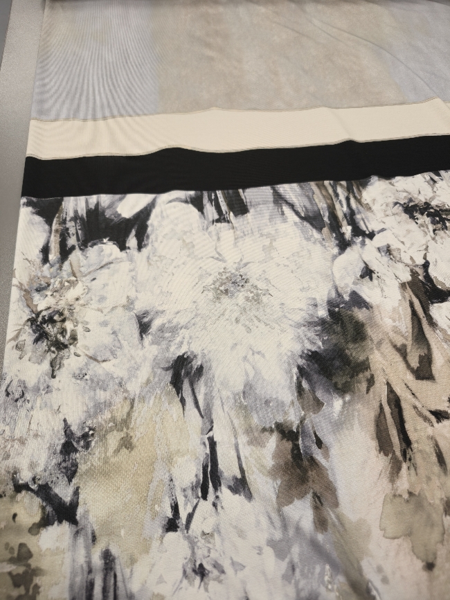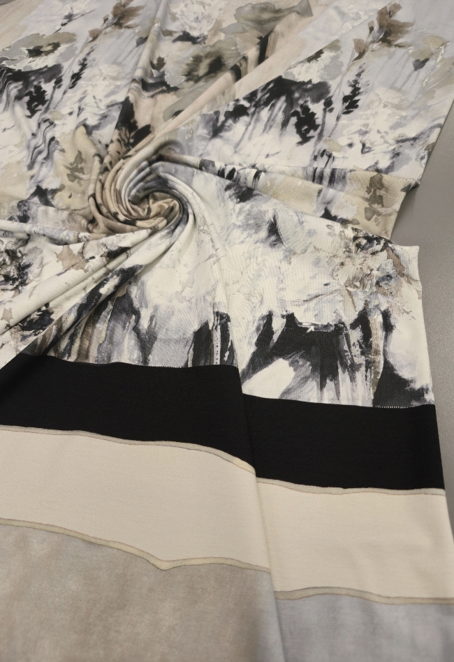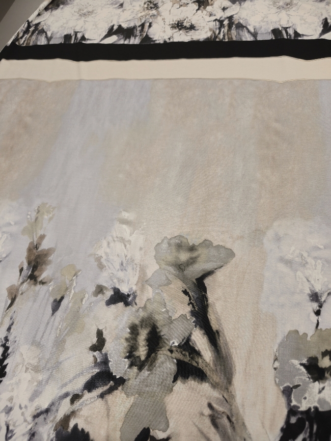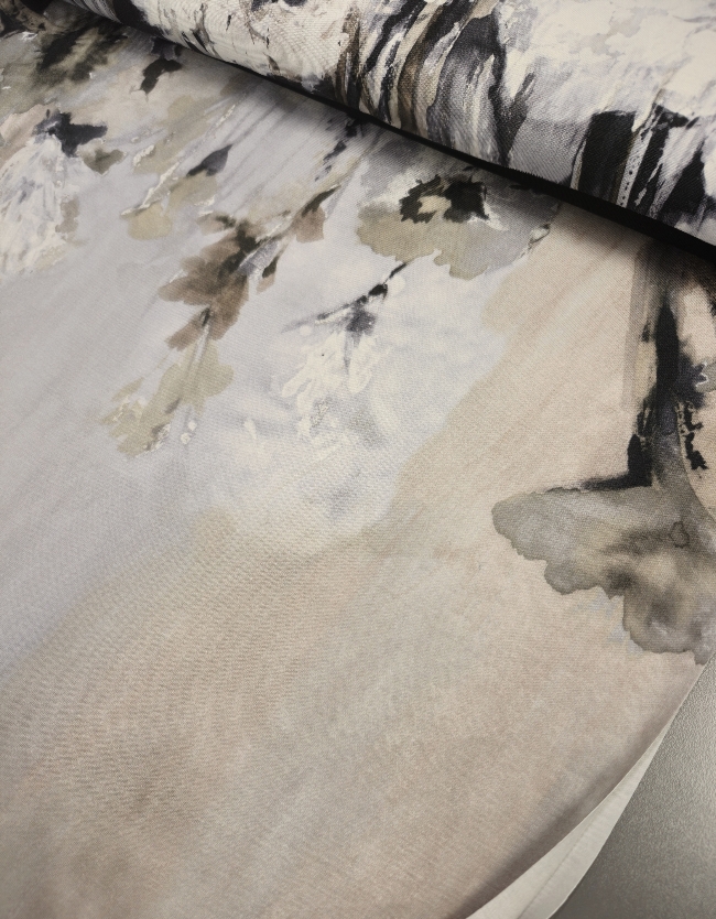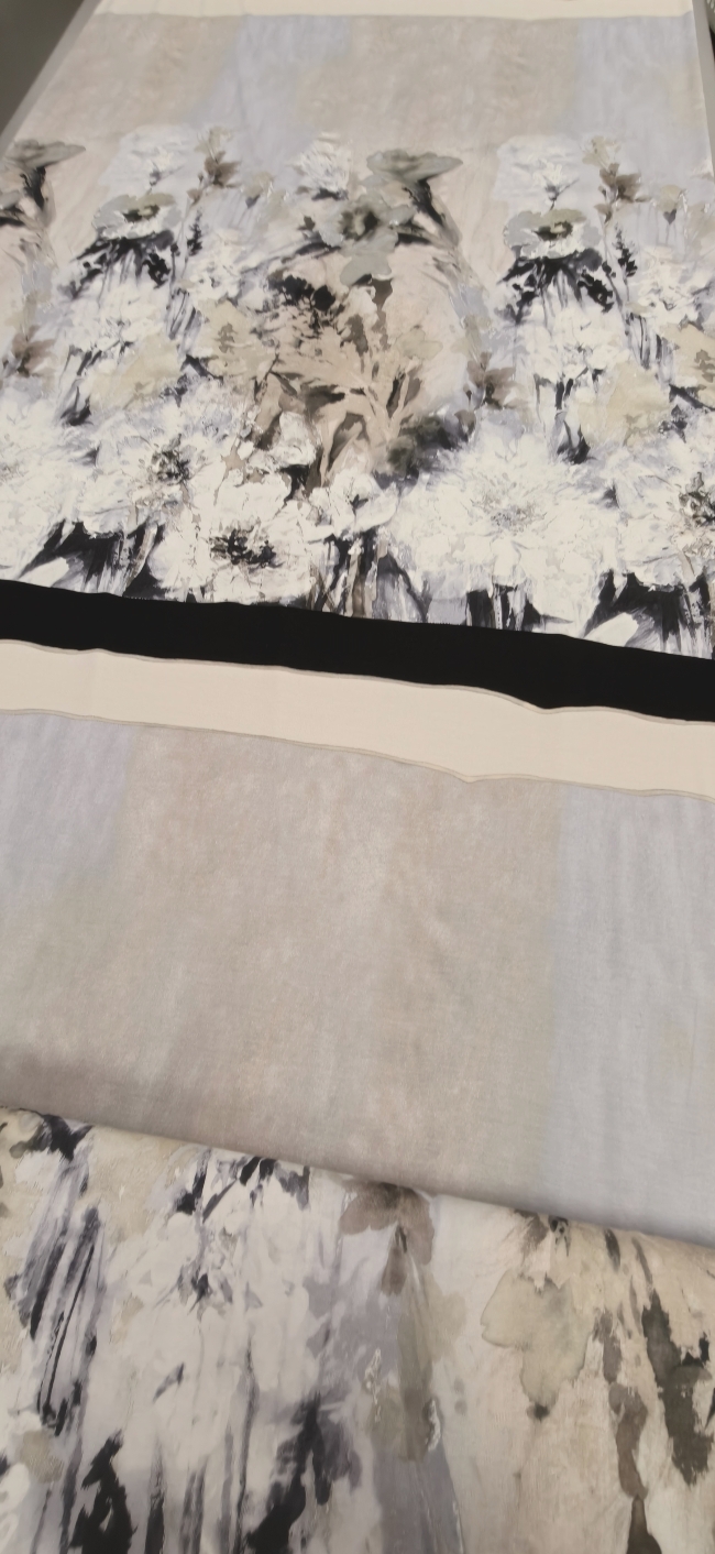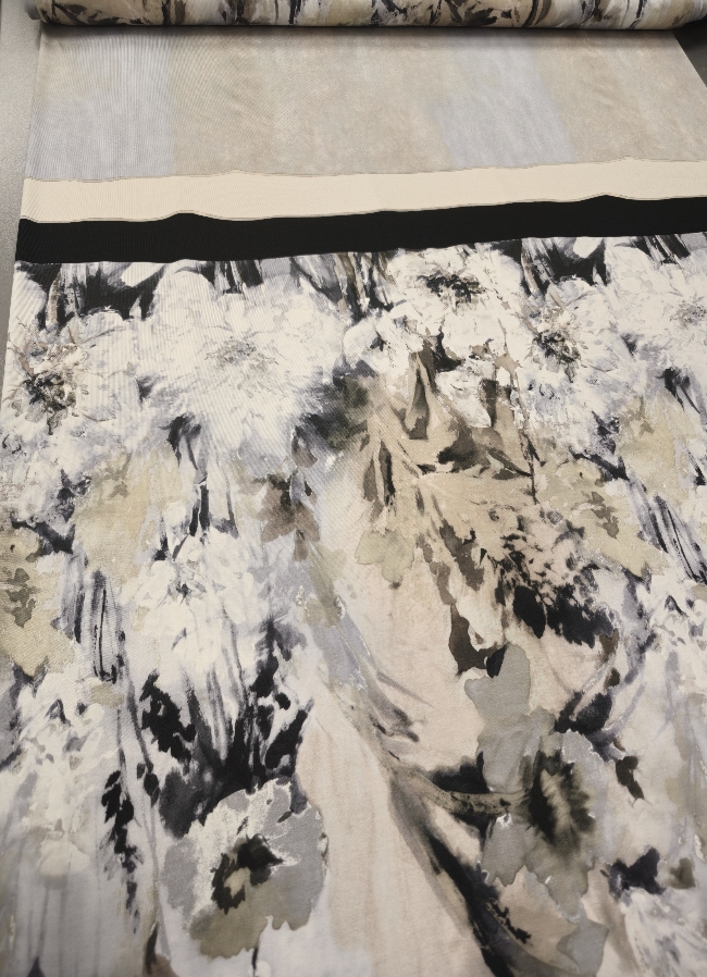 Otkrijte šarmantni žersej s nježnim cvjetnim motivom i obrubom koji se ponavlja na svakom metru. Tkanina u prekrasnim zemljanim nijansama (220 g/m²) kombinira udobnost, fleksibilnost i sofisticiran izgled – idealan izbor za tunike, košulje, haljine ili stvaranje jedinstvenih komada s ukrasnim panelima.