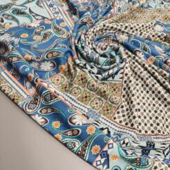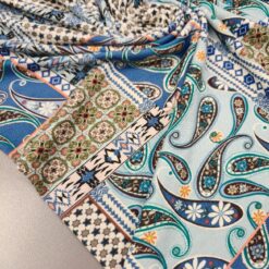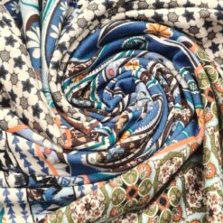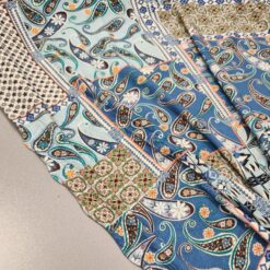 Orijentalni patchwork jersey (130 g/m²) je elastičan i udoban materijal, idealan za šivanje raznih odjevnih predmeta poput majica, tunika, haljina i sportske odjeće. Klasična plavo-tirkizna kombinacija boja daje svakom odjevnom predmetu moderan i sofisticiran izgled. Svojom mekoćom i fleksibilnošću, ovaj jersey je izvrstan izbor za udobne i elegantne odjevne predmete.