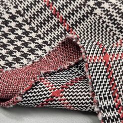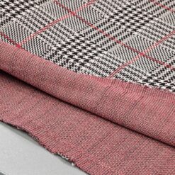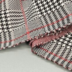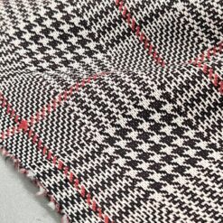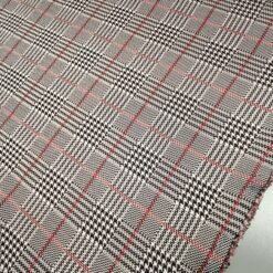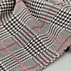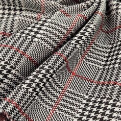 Džersej s uzorkom pepita i bordo crvenim karo uzorkom (210 g/m²) je elegantan i udoban materijal, idealan za šivanje raznih odjevnih predmeta poput majica, džempera, haljina i sportske odjeće. Dizajniran za dugotrajnu udobnost, nudi izvrsnu elastičnost i mekoću.