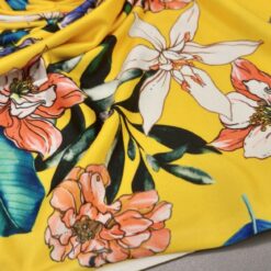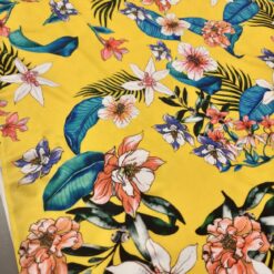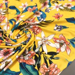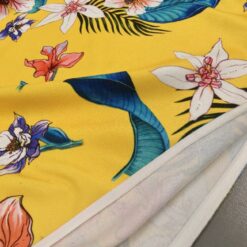 Rastezljiva likra sa živopisnim tropskim cvjetnim uzorkom u svježim žutim nijansama. Mekana, elastična i udobna tkanina koja lijepo pristaje tijelu i omogućuje potpunu slobodu kretanja.
