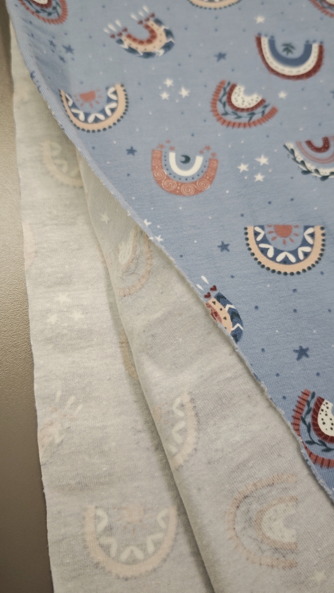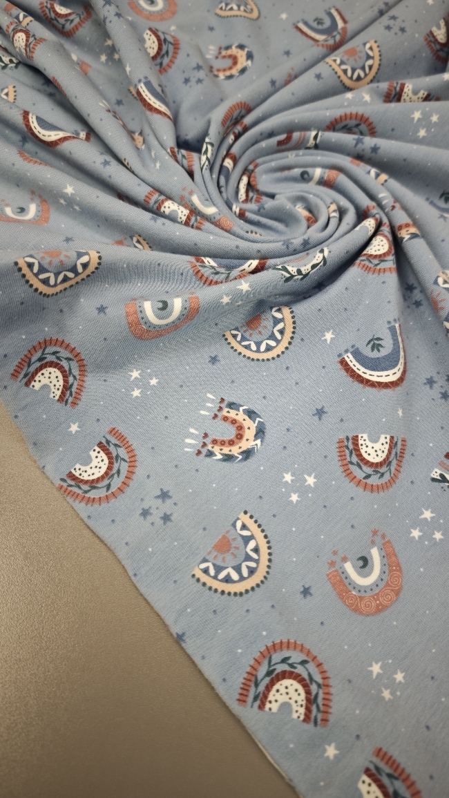 Dječji pamučni jersey u nježno plavoj nijansi sa slatkim boho mašnama i sitnim zvjezdicama savršen je izbor za udobnu, mekanu i svakodnevnu odjeću za mališane. Materijal je nježan za kožu, taman pravu količinu elastičnosti i odličan za sve što treba biti mekano i rastezljivo.
