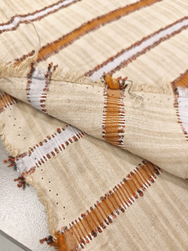 🌿 Natur lan-viskoza s narančastim prugama – lagana prozračna ljetna tkanina