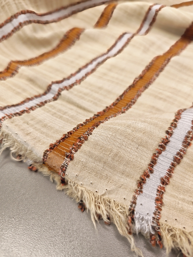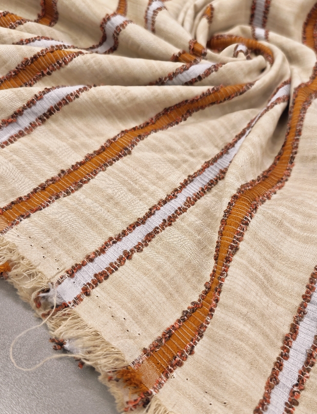 Lagana lan-viskoza s prirodnim izgledom i ugodnim padom. Prozračna, mekša na dodir i vrlo ugodna za nošenje u toplim danima. Narančaste pruge daju svjež, ljetni izgled i čine tkaninu idealnom za haljine, košulje, tunike i lagane hlače.