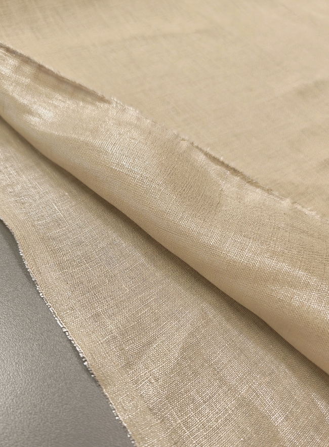 Prirodni bež lan sa diskretnim srebrnim sjajem. Lagan, prozračan materijal s prirodnim izgledom, idealan za haljine, košulje i ljetnu odjeću.