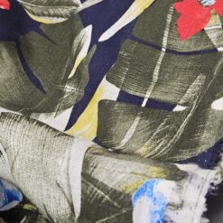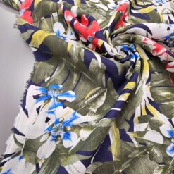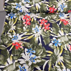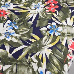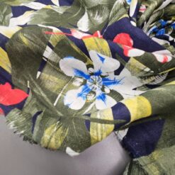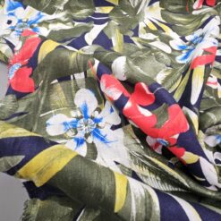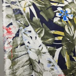 Tamnoplava lanena elegancija s cvjetnim uzorkom – sofisticirana tkanina izrađena od mješavine lana, pamuka i poliestera, koja kombinira prirodan izgled, prozračnost i jednostavno održavanje. Romantični cvjetni motiv na tamnoplavoj pozadini pruža eleganciju s prirodnim dodirom. Idealan izbor za lagane ljetne haljine, bluze, tunike, suknje ili uređenje doma.