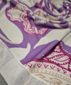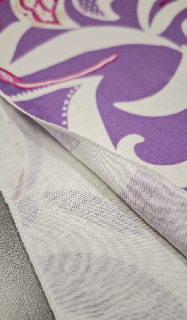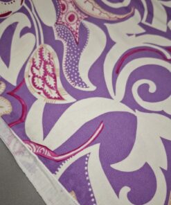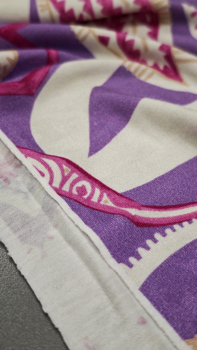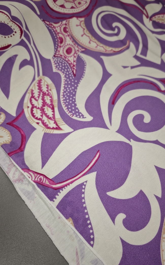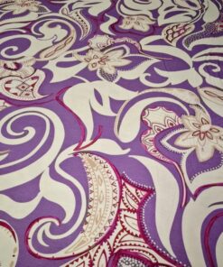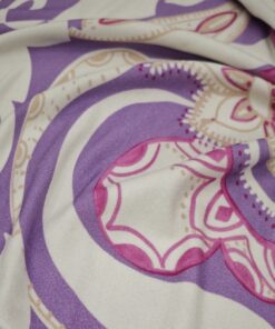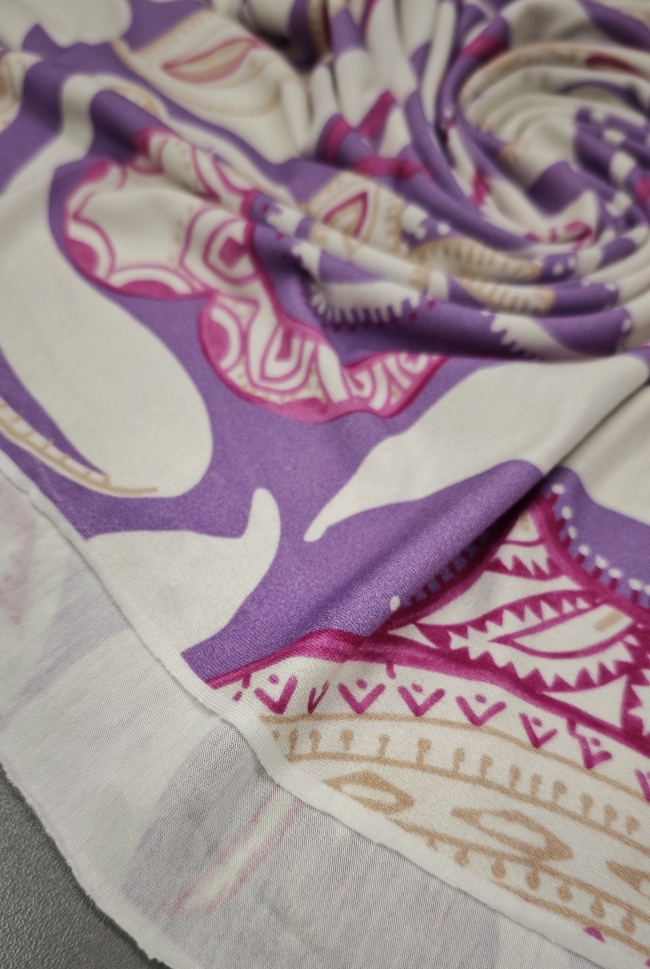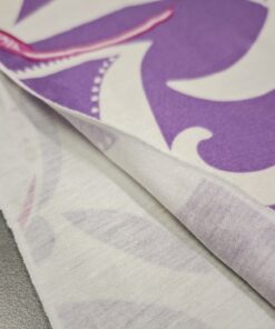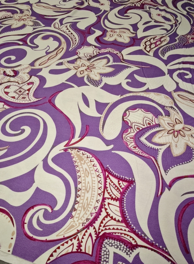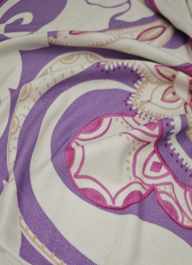 Mekani elastični jersey u ljubičastoj boji s diskretnim ornamentnim uzorkom. Ugodan na dodir, lijepo pada i dobro se prilagođava tijelu. Pogodan za haljine, tunike, majice, tajice i lagane suknje. Uzorak daje izražajnost bez pretjerivanja, materijal je praktičan za svakodnevno nošenje i šivanje.