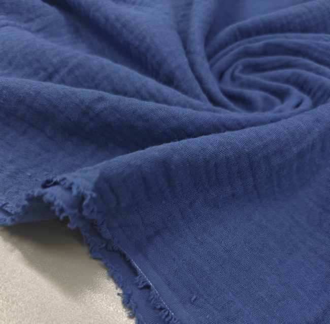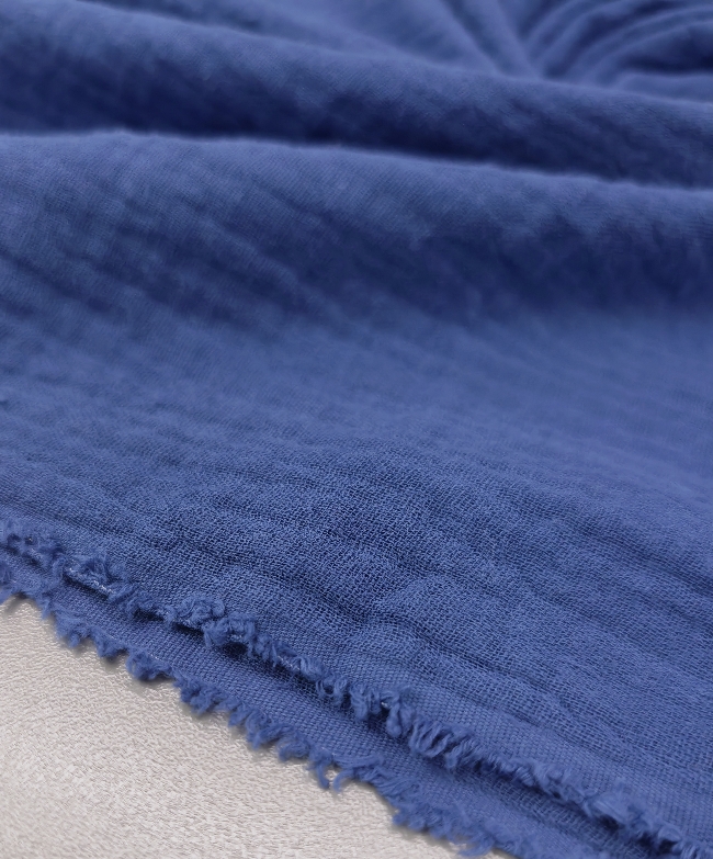 Lagana, prozračna i mekana dvoslojna tetra tkanina u traper plavoj boji. Dva tanka sloja nježno su spojena, što materijal čini punijim, ali i dalje ugodno mekim i prirodnim na dodir. Površina ima karakterističnu blago valovitu strukturu, što daje opušten, svakodnevni izgled. Pogodno za odjeću koja zahtijeva udobnost i prozračnost – ljetne bluze, košulje, haljine, tunike, dječju odjeću, šalove i lagane hlače. Također odlično za dekice, pelene, vreće za spavanje i dječje dodatke. Traper plava boja je praktična, lako se kombinira i pogodna je za sve generacije. Tkanina prekrasno pada, diše i ugodna je za nošenje tijekom cijele godine.