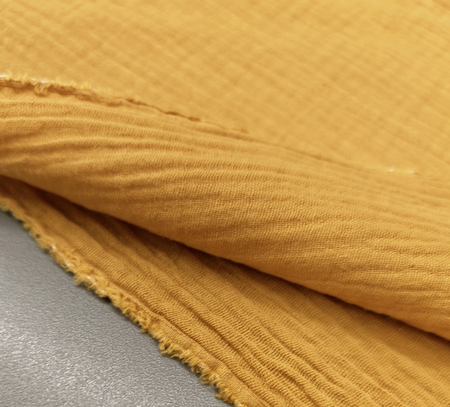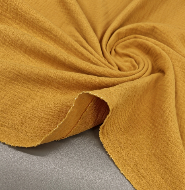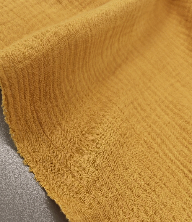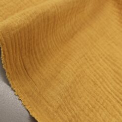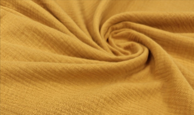 Mekana i prozračna dvoslojna tetra u toploj oker boji. Prirodna, ugodna na koži i dovoljno kompaktna zbog dva sloja. Pogodna za haljine, bluze, košulje, dječju odjeću, kombinezone, šalove, dekice i tetra pelene. Odličan izbor za proljeće i ljeto. Oker nijansa daje proizvodima toplinu i prirodan izgled te se lijepo kombinira s prirodnom, bijelom ili maslinastom bojom.