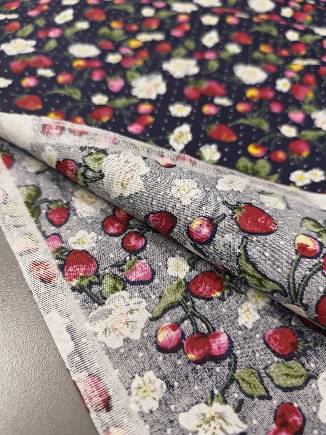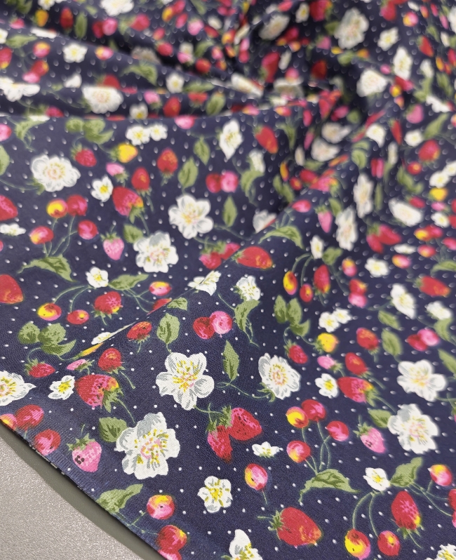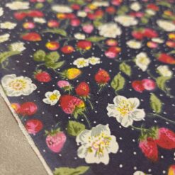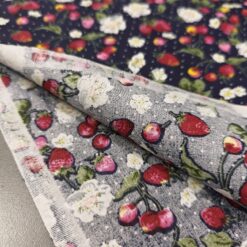 Pamučni popelin s motivom jagoda na tamnoplavoj podlozi. Gladak, lagan i prozračan materijal. Pogodan za haljine, košulje, bluze i dječju odjeću. Lako se šije i ugodan za nošenje.