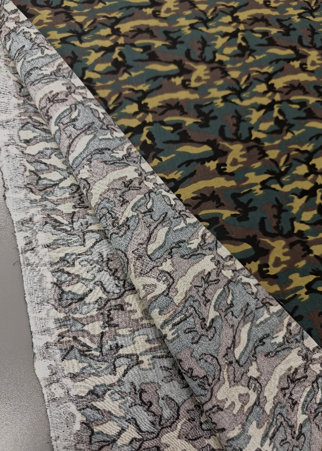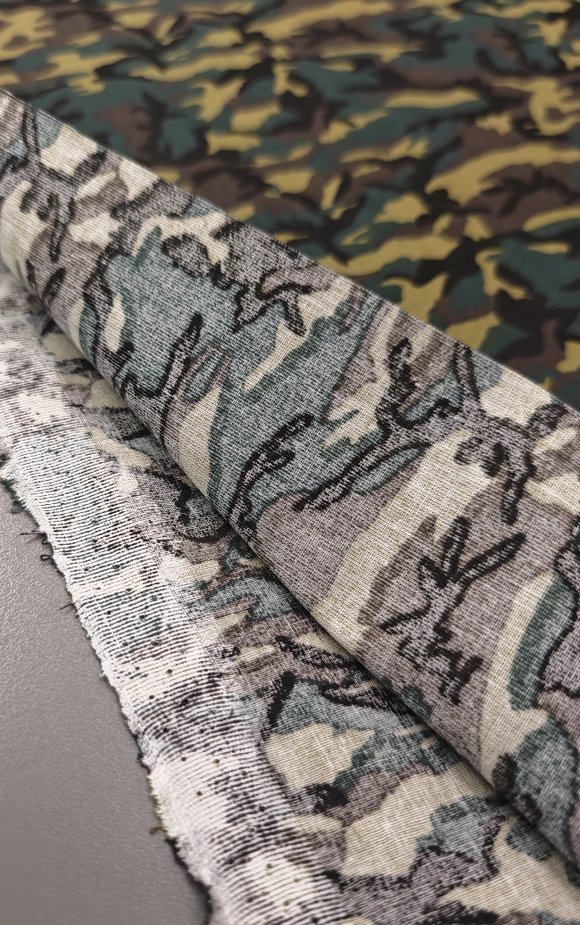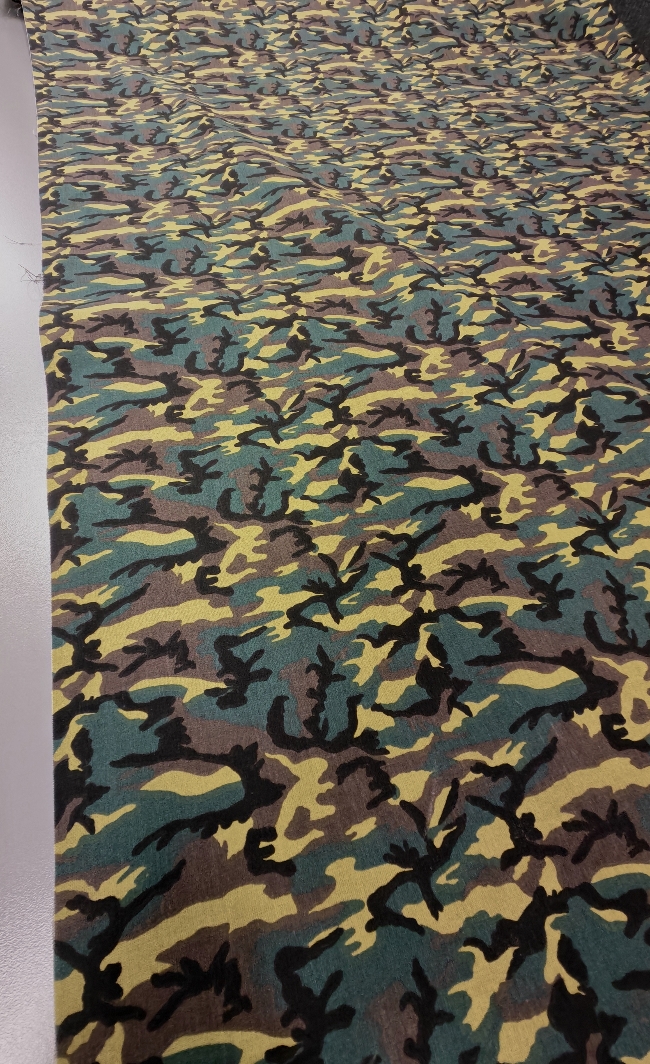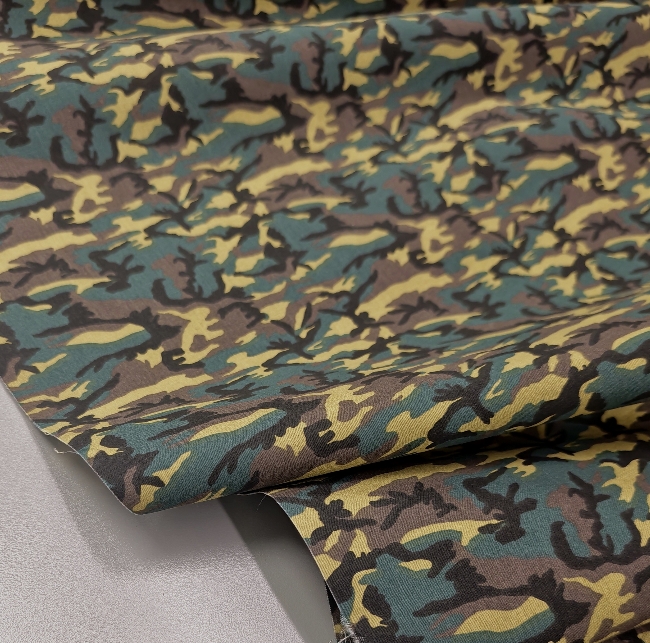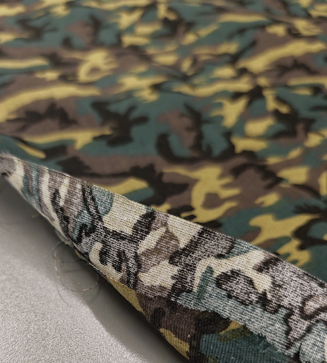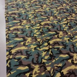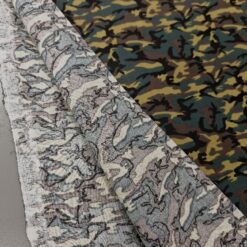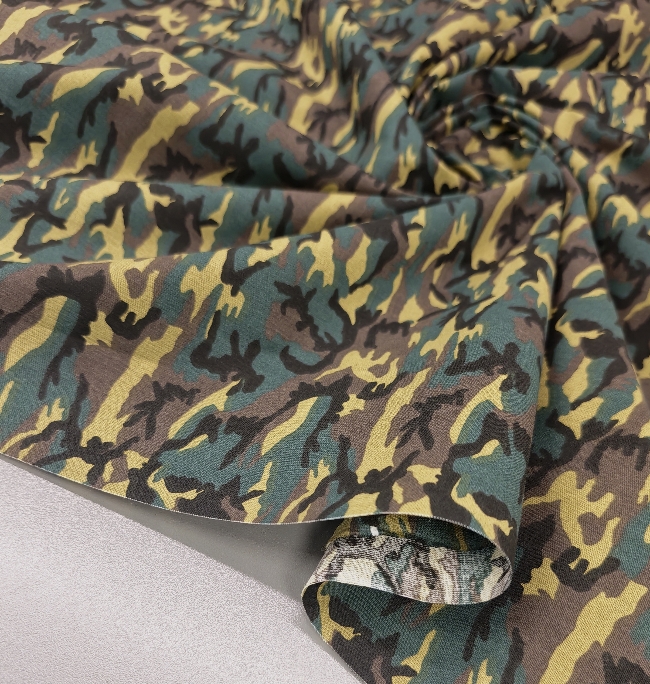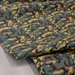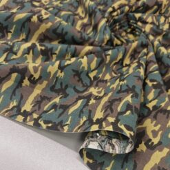 Kvalitetan pamučni popelin s klasičnim kamuflažnim uzorkom u zeleno-smeđim tonovima. Površina je glatka, tkanje gusto, materijal ugodan na dodir s prirodnim, mat izgledom.