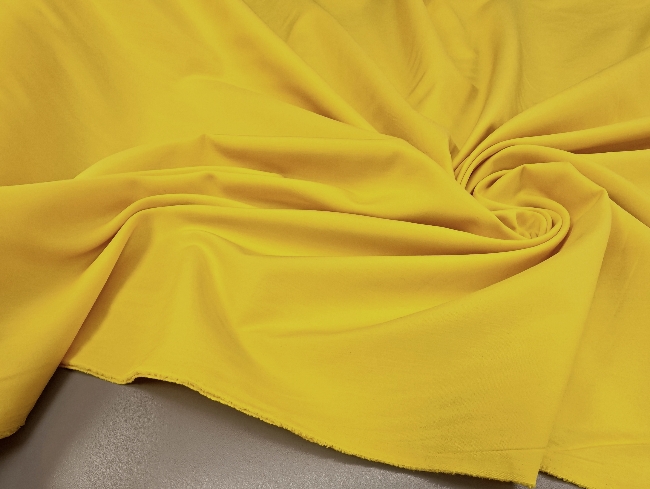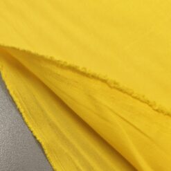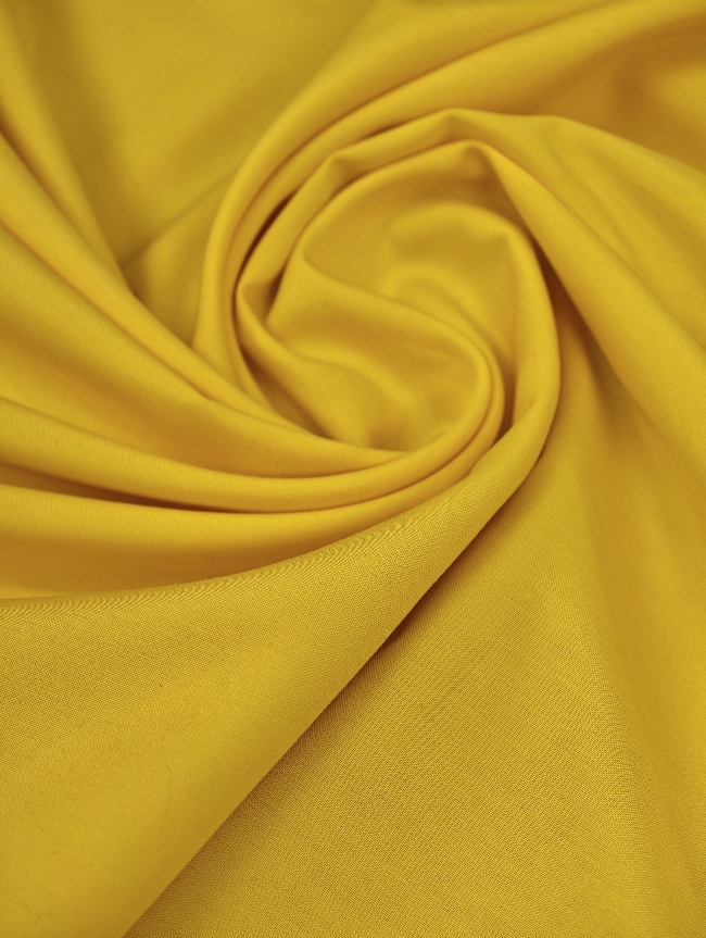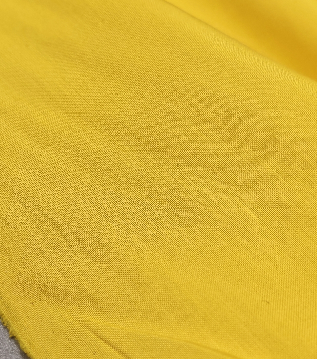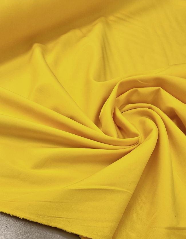 Žuti pamučni poplin je lagana, glatka i kompaktno tkana tkanina ujednačene strukture, koja daje uredan i čist izgled. Površina je ugodna na dodir, bez hrapavosti, materijal dobro drži oblik i ostaje stabilan čak i pri nošenju i pranju.