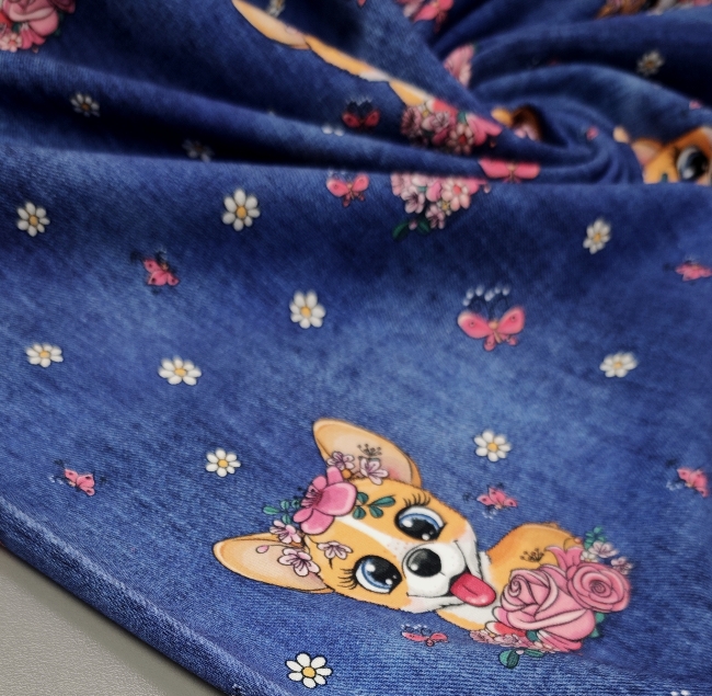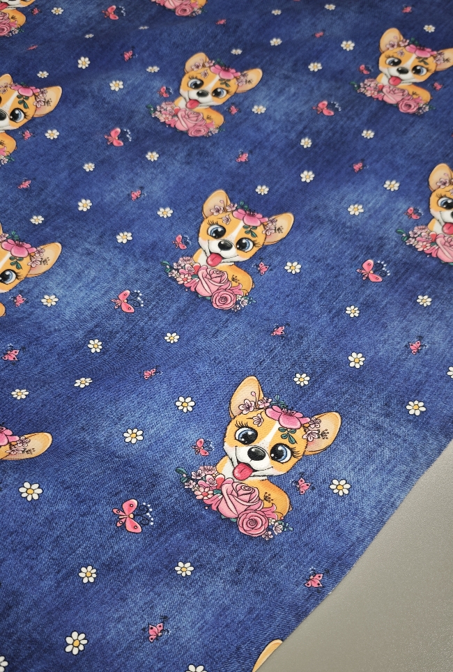 Pamučni dječji jersey – plavi sa simpatičnim psićima i cvjetićima (250 g/m²)