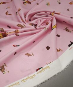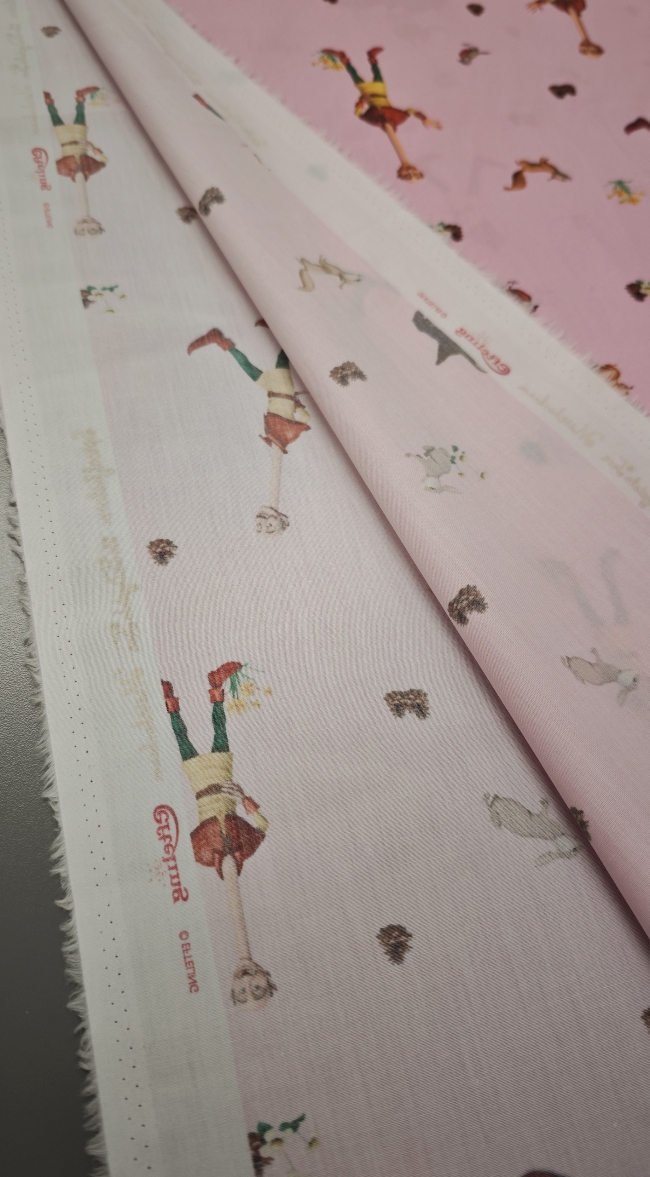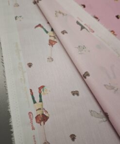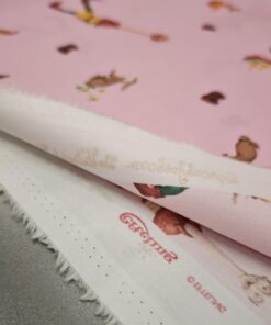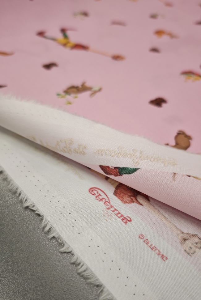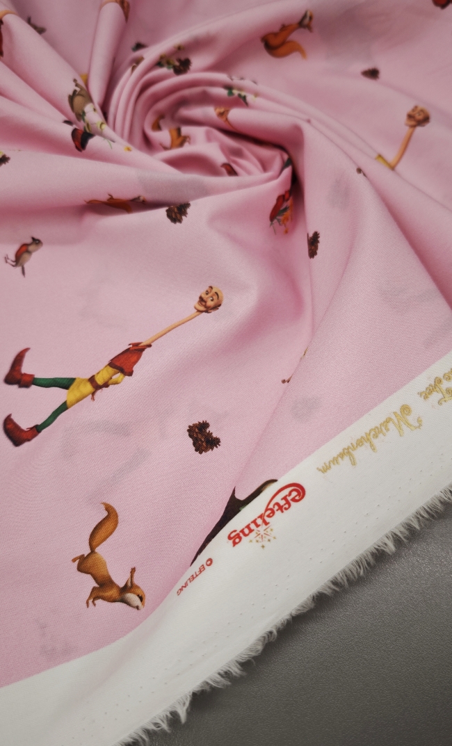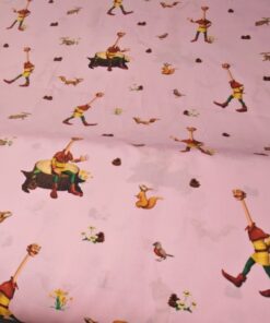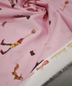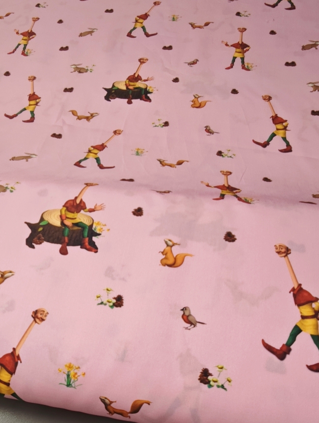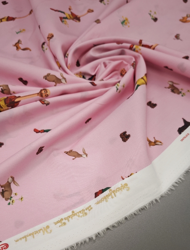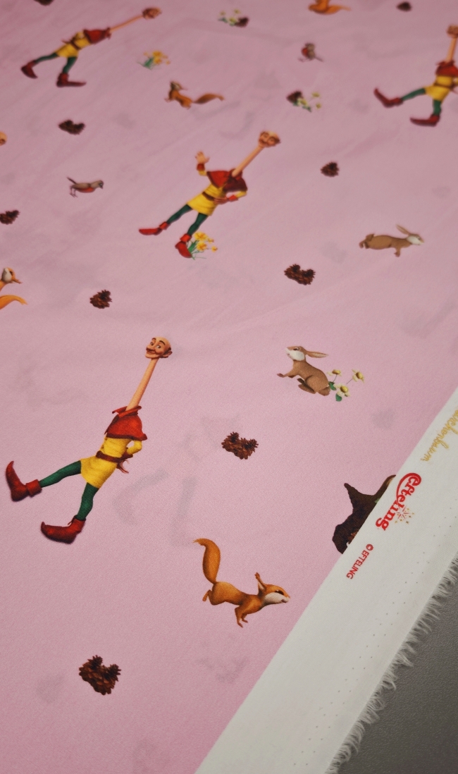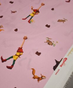 Nježni pamučni poplin s toplim ružičastim tonom i ilustracijom bajkovite šume u kojoj se pojavljuje razigrani dječak. Uzorak djeluje mekano, toplo i dječje, ali ostaje dovoljno miran da ne umara pogled. Tkanina je lagana, glatka i ugodna na dodir, s lijepim padom i stabilnom strukturom, što je čini iznimno praktičnom za šivanje.