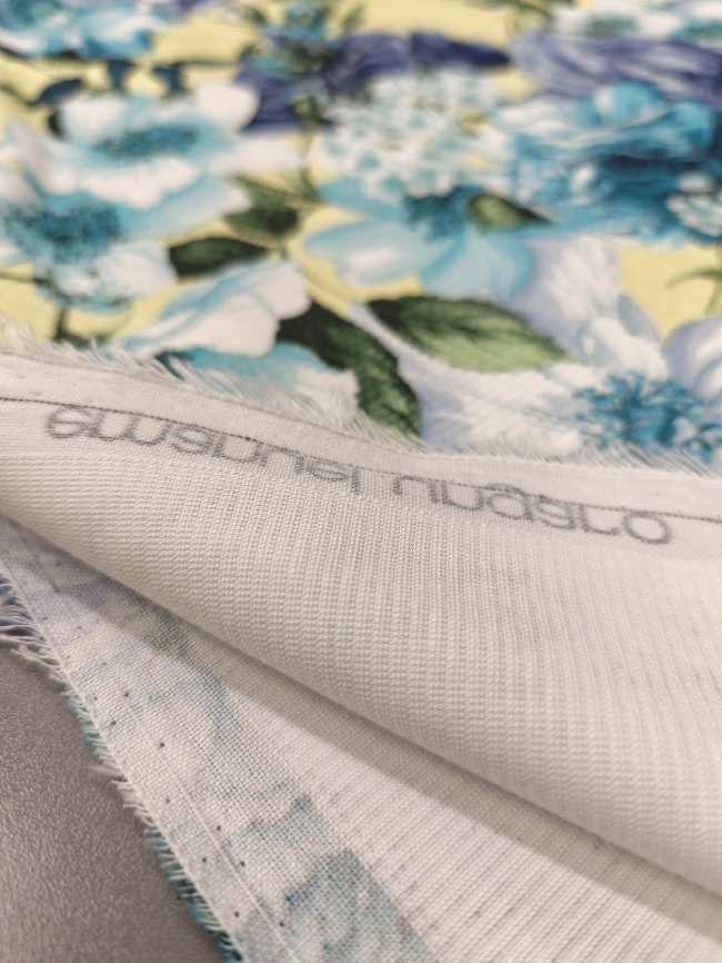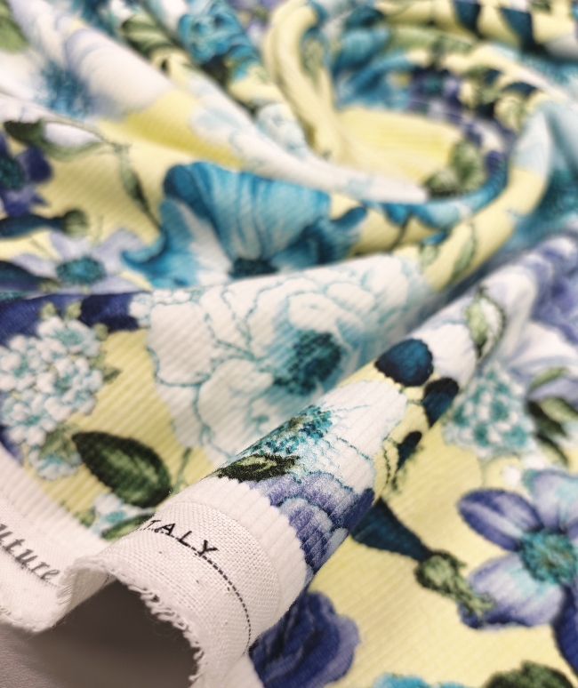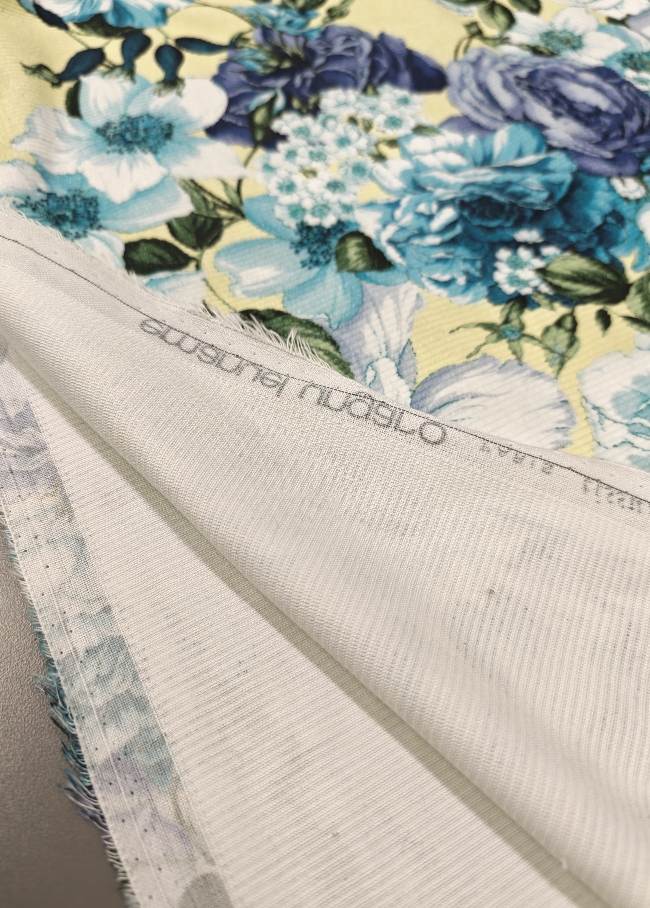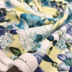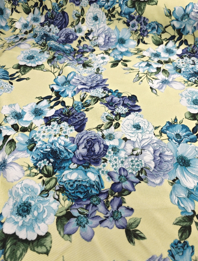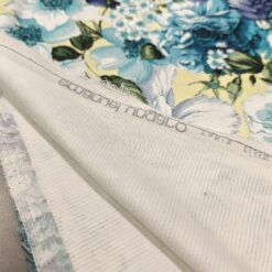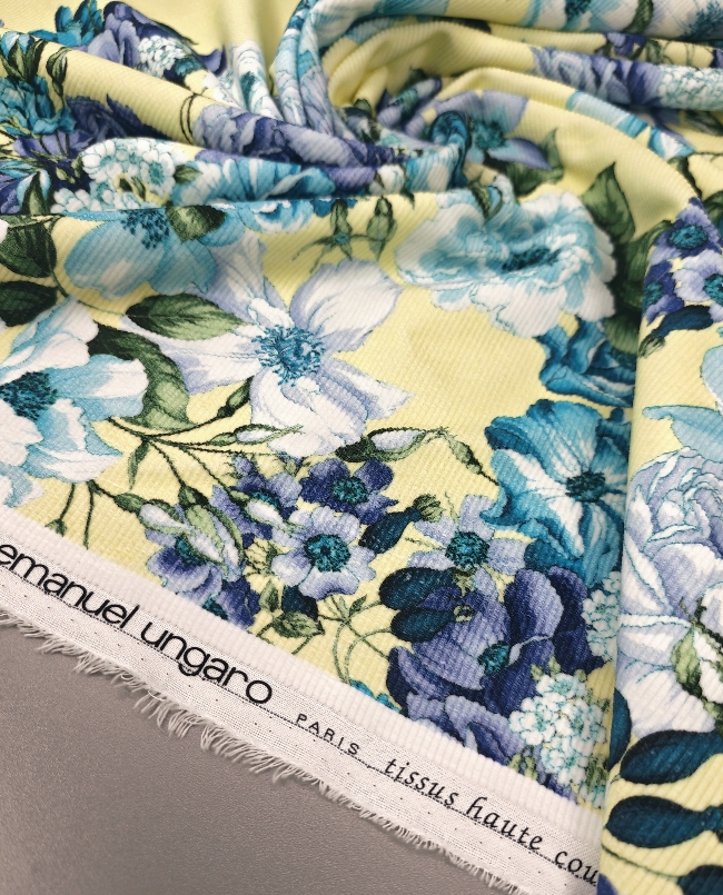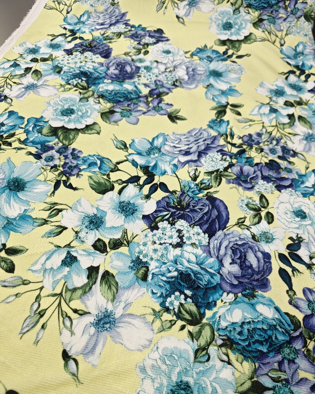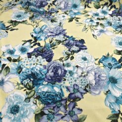 Vanilija žuti pamučni baršun s plavim cvjetnim uzorkom. Mekan i pun materijal za haljine, suknje, sako i lagane jakne, idealan i za zavjese i jastuke. Topla vanilija podloga s plavim cvjetovima lako se uklapa u moderne i klasične kombinacije.