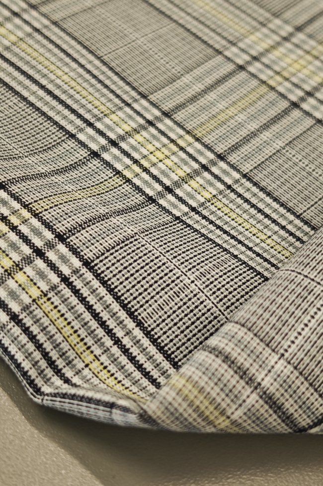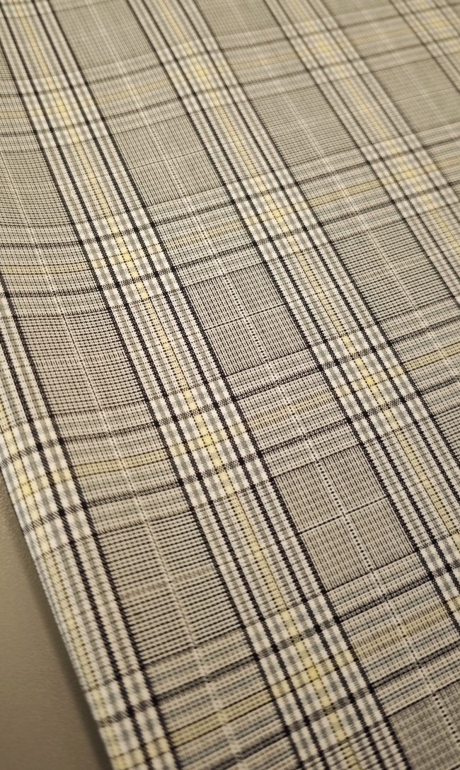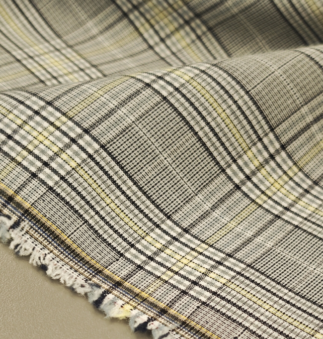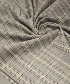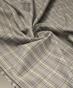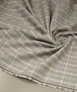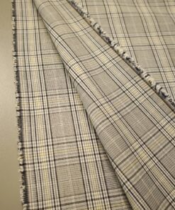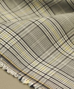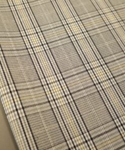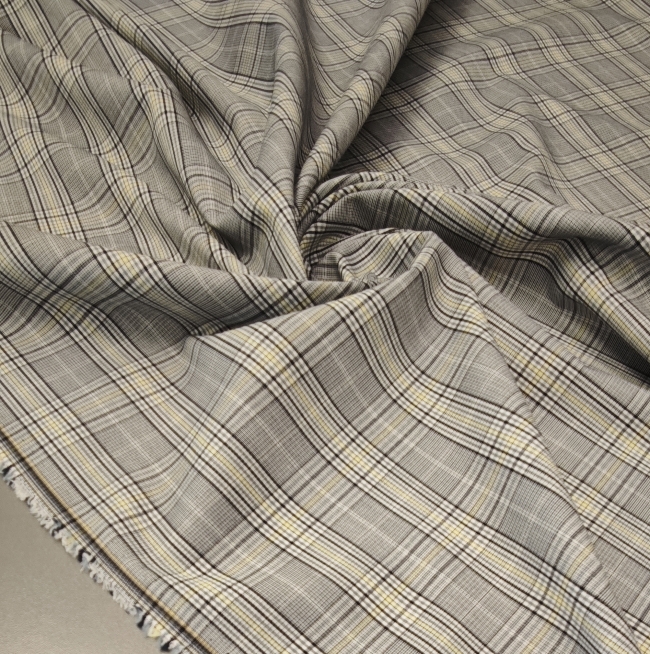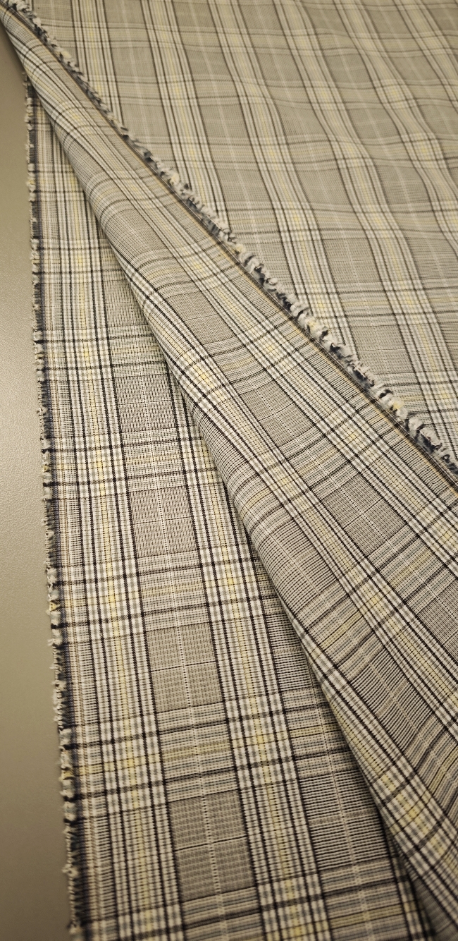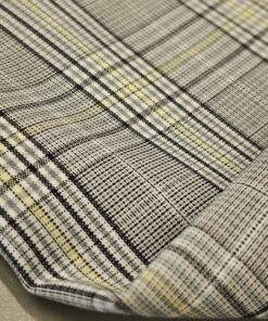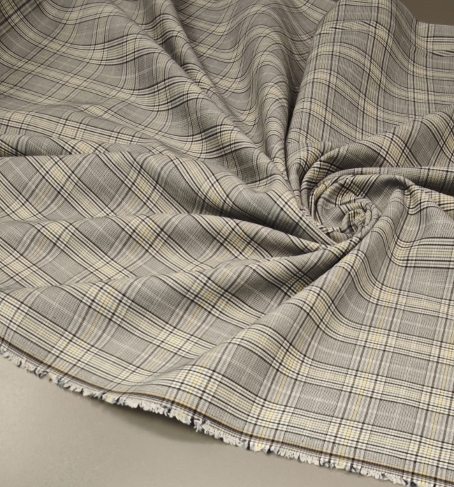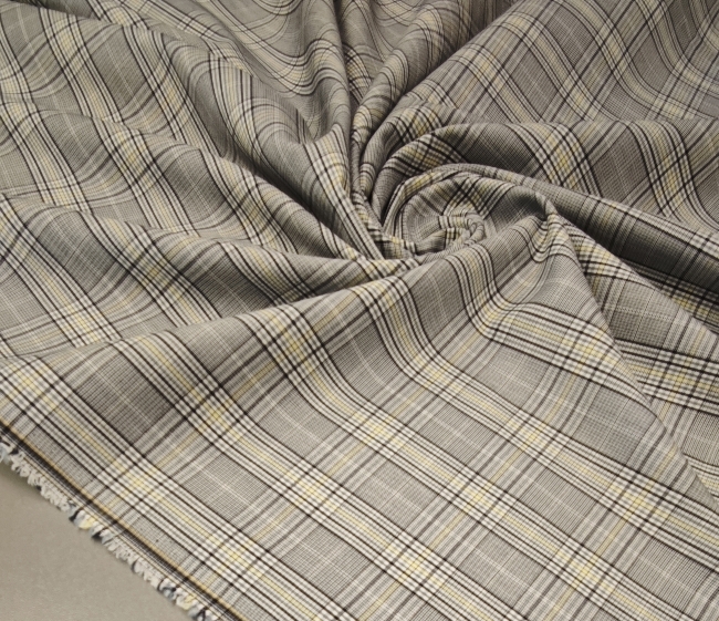 Ova elegantna svijetlosiva karo tkanina sa suptilnom žutom crtom idealan je izbor za modne kostime i sakoe. Tanji diolen lagano prati liniju tijela, a istovremeno osigurava potrebnu strukturu i uredan pad.
