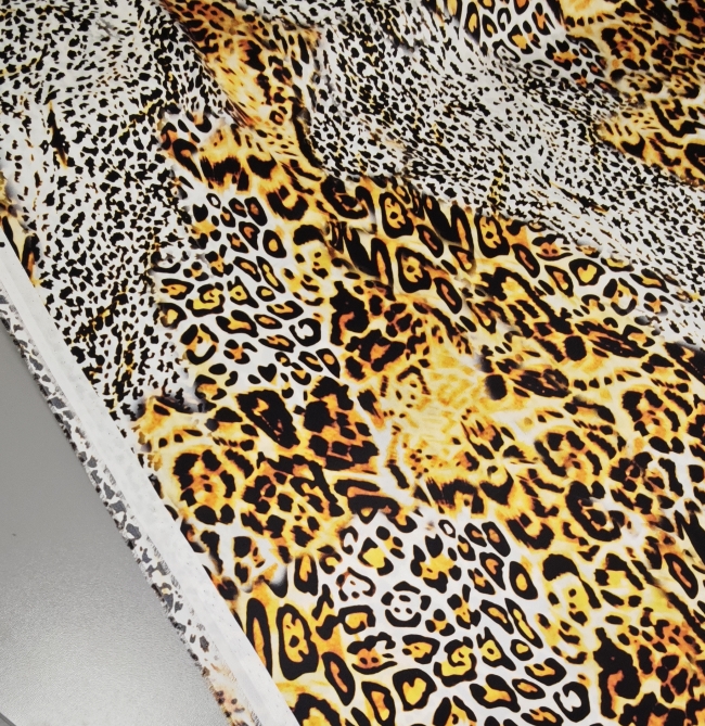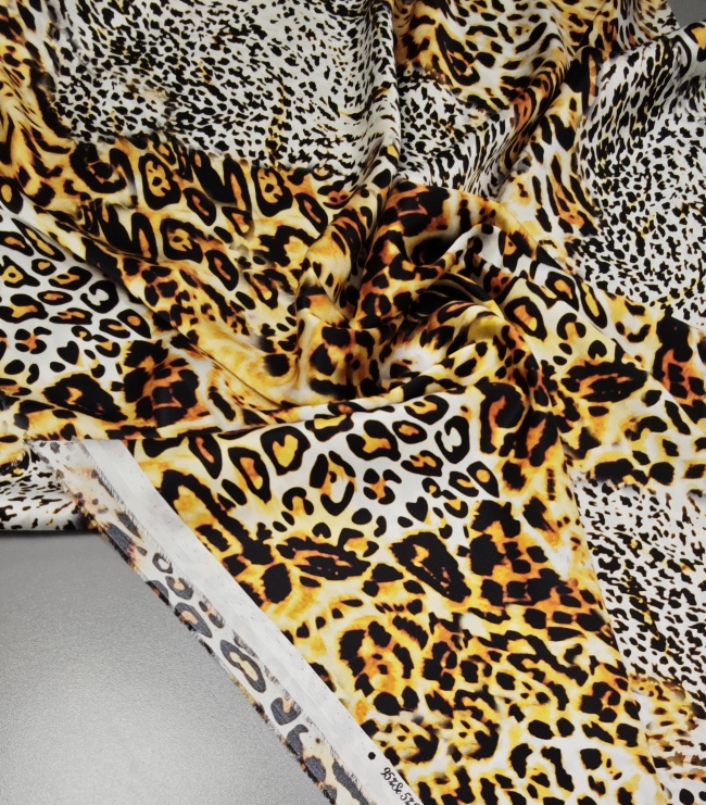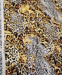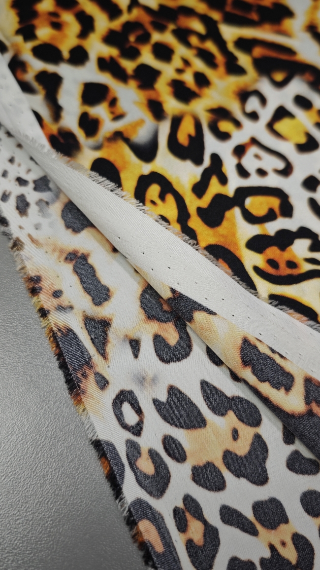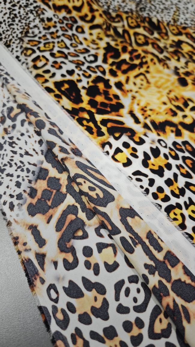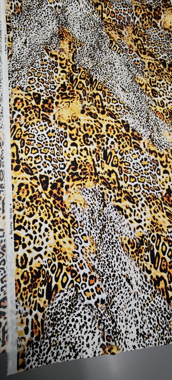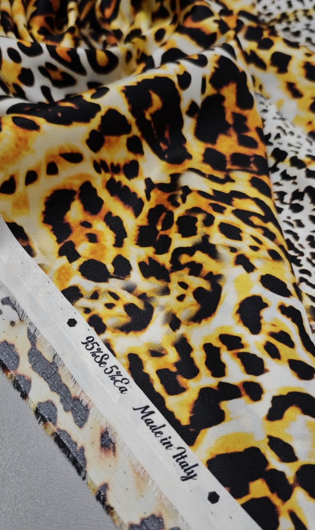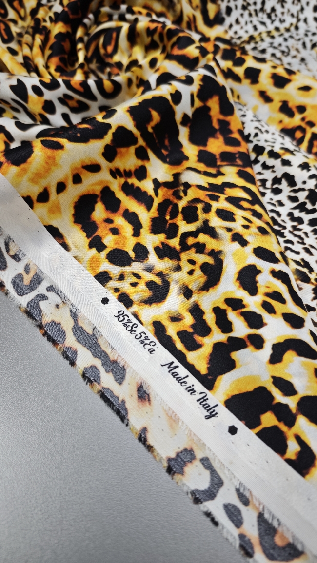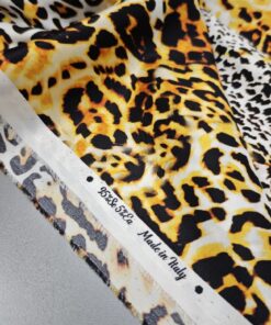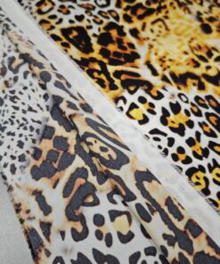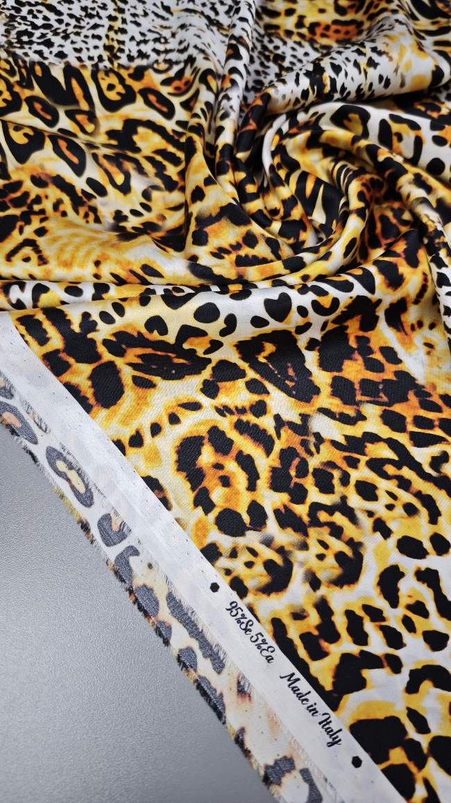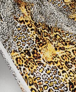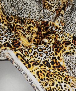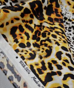 Luksuzna svilena tkanina u zlatnom leopard uzorku donosi mekoću, elegantan pad i profinjen sjaj. Elastan osigurava udobnije pristajanje i ljepše oblikovanje, što materijal čini idealnim za projekte kojima je potrebna glamurozna, vizualno snažna estetika.